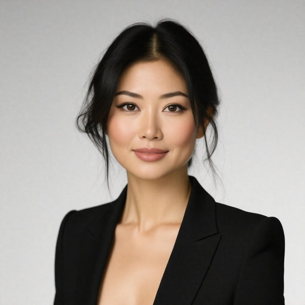 "Generate a realistic portrait of Kelly Hu, a Chinese-American actress, model, and voice actor, in a professional and elegant setting, incorporating subtle hints to her notable works and diverse career, with a warm and confident expression, dressed in a stylish outfit, against a soft, neutral background."