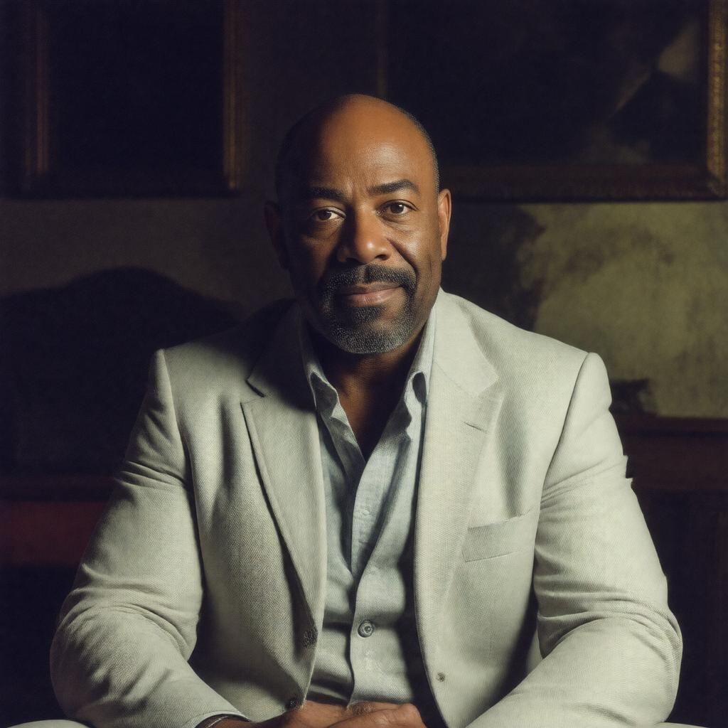 "Generate a realistic portrait of Ken Foree, an American actor, sitting in a dimly lit room with a subtle horror-themed background, reflecting his notable work in the horror genre, with a serious expression and a hint of a smile, wearing a simple yet elegant outfit, in a style that blends classic Hollywood glamour with a touch of modern realism."
