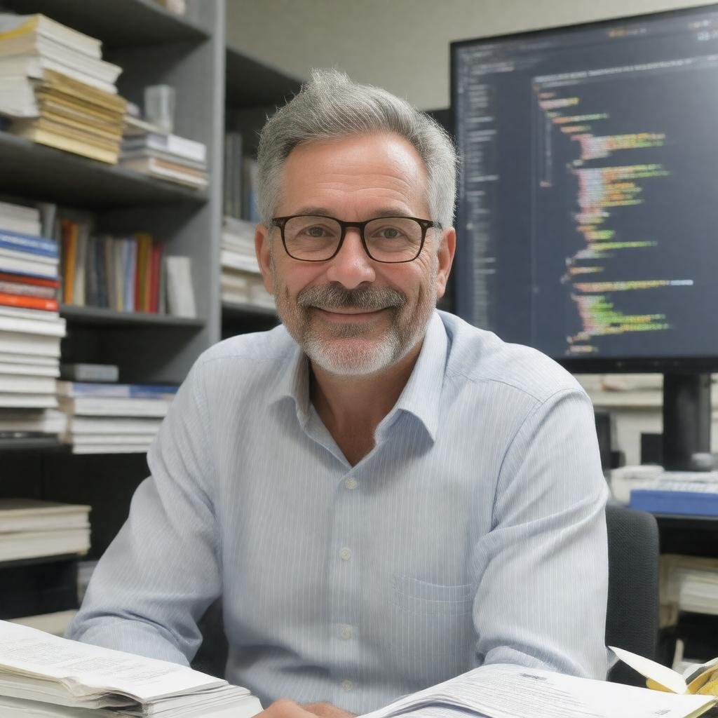 Generate a realistic image of a middle-aged American man with a gentle smile, wearing a pair of glasses and a casual button-down shirt, sitting in front of a computer screen displaying lines of code in a programming language, surrounded by stacks of books and papers on computer science and Lisp programming, with a subtle background hint of a university or research institution, representing Kent Pitman, a prominent computer scientist and software engineer known for his contributions to the Lisp community.
