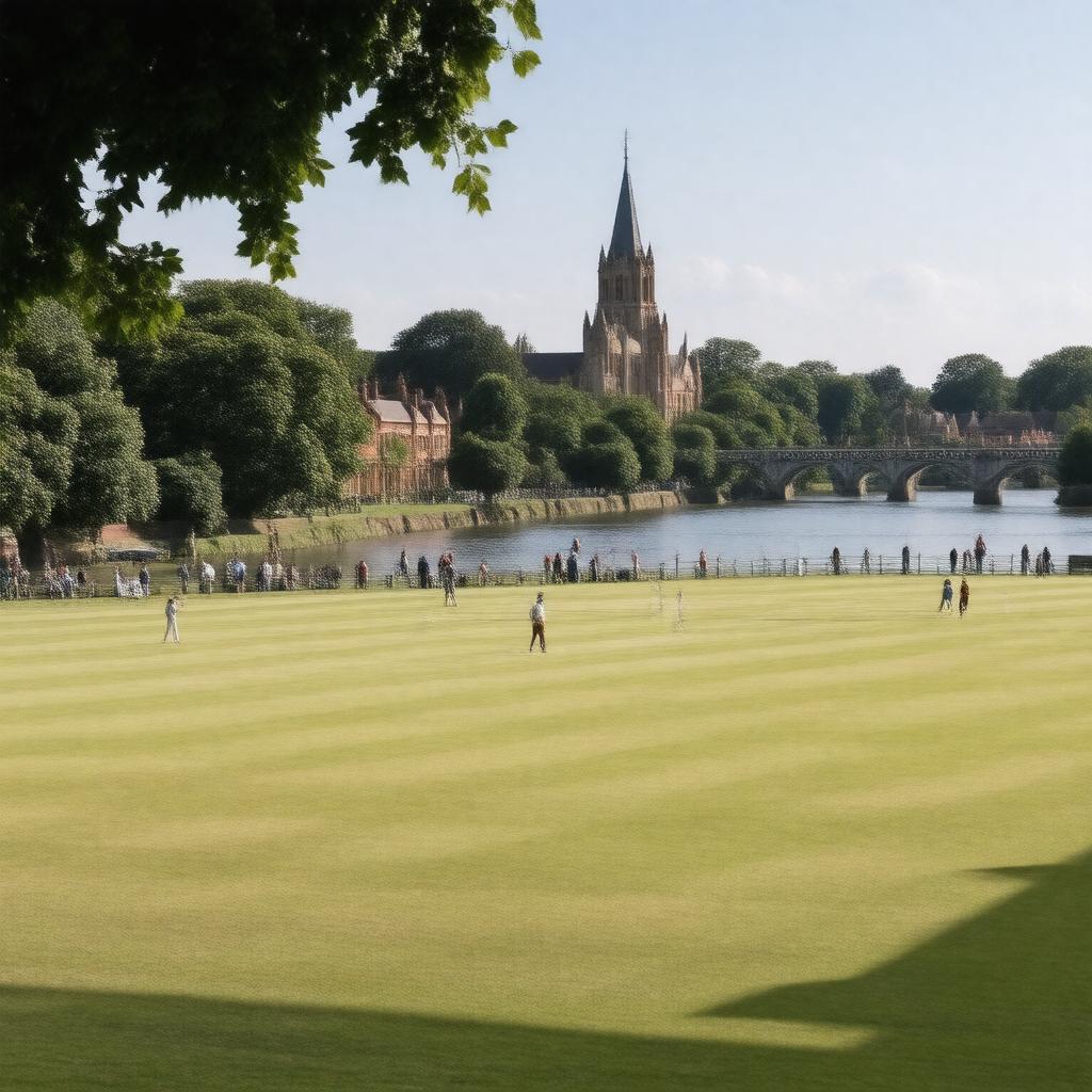 "Generate an image of a serene and lush green space in a village setting, with a cricket pitch in the foreground and the iconic Kew Gardens adjacent to it. In the background, include the majestic St Anne's Church, Kew Palace, and Kew Bridge, with the River Thames flowing gently. The scene should reflect a sunny day with people engaging in public recreation and cricket activities. The image should be in a realistic style, capturing the essence of a village common land in England, specifically Kew Green in the London Borough of Richmond upon Thames."