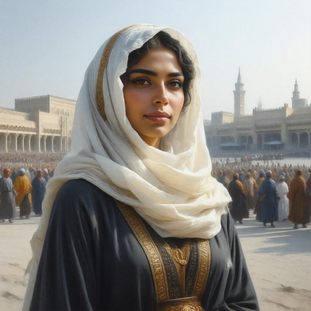 "Generate an image of a dignified and elegant 7th-century Arabian woman, Khadijah bint Khuwaylid, dressed in traditional attire, with a gentle and compassionate expression, set against a backdrop of the city of Mecca, with subtle hints of her wealth and business acumen, reflecting her legacy as a highly respected figure in Islam, the first wife of Prophet Muhammad, and a devoted supporter of the early Islamic movement."