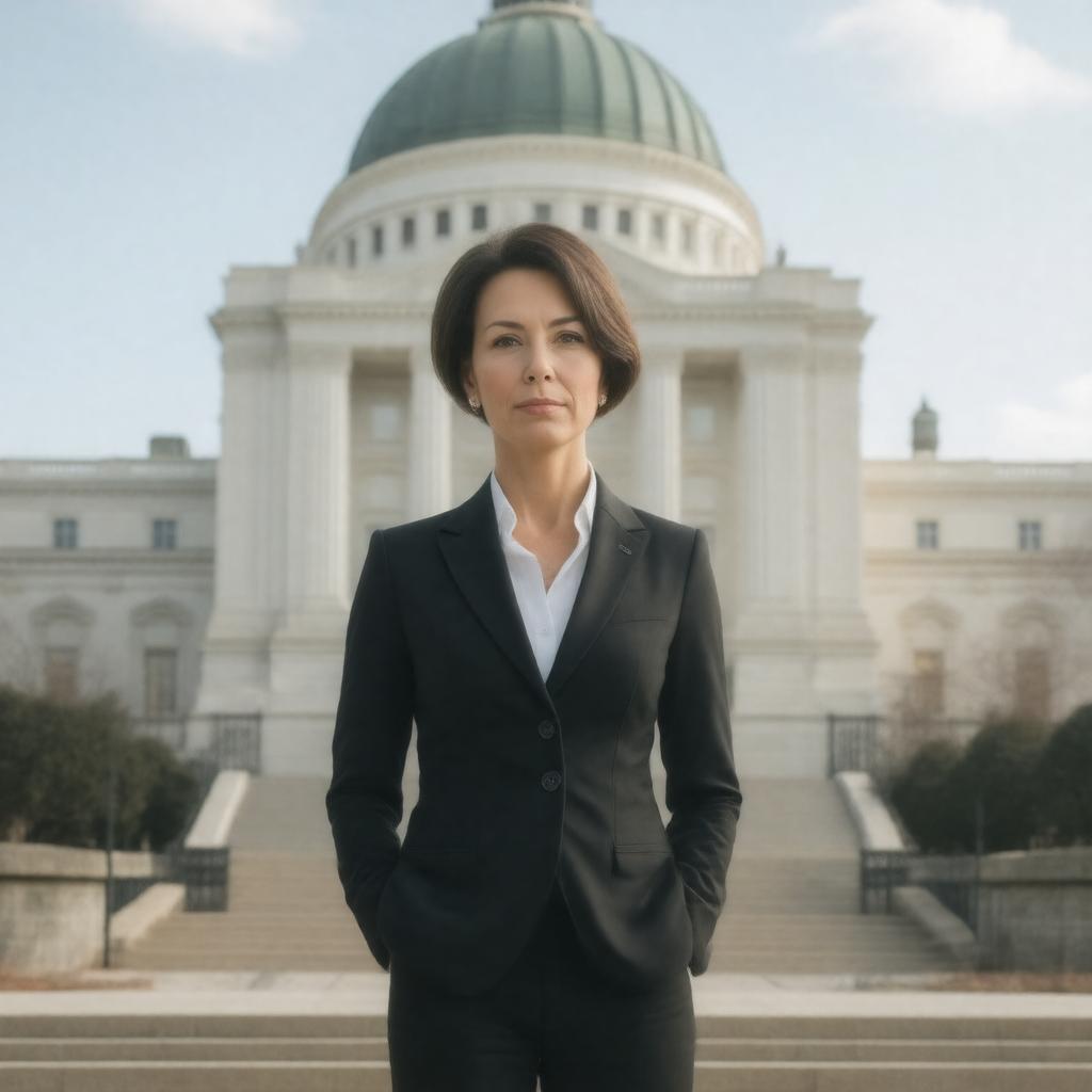 "Generate a realistic portrait of Kim Reynolds, the 43rd Governor of Iowa, standing in front of the Iowa State Capitol building, dressed in a formal business suit, with a confident expression, representing her as a prominent American politician and leader, in a style that reflects her professional and public persona."