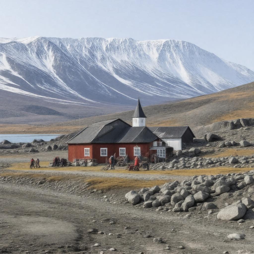 Generate an image of a small, remote hamlet situated on the rugged coastline of Baffin Island, Nunavut, Canada. The hamlet, named Kimmirut, features a few scattered buildings, including a church and some homes, with a backdrop of rocky terrain and possibly some snow-capped mountains. Incorporate a few Inuit-style houses and possibly some residents engaging in traditional activities such as hunting or crafting, to reflect the community's main economic activities. Ensure the image captures the essence of a small, Arctic hamlet with a strong Inuit culture. Style: realistic, with a hint of serene and isolated wilderness.