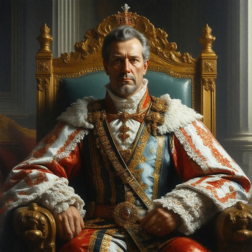 "Generate a realistic portrait of King Frederick I of Sweden, dressed in 18th-century royal attire, with a stern expression, standing in a lavish throne room with ornate furnishings and decorations, symbolizing his reign as the monarch of Sweden from 1720 to 1751, in a neoclassical style reminiscent of European royal portraits from the time period."