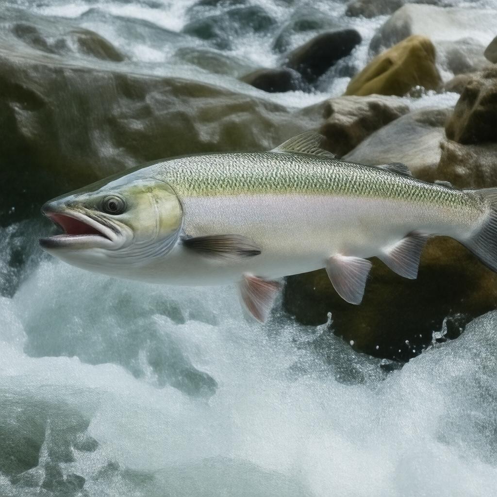 "Generate a vibrant and detailed image of a King salmon (Oncorhynchus tshawytscha) in its natural habitat, showcasing its distinctive blue-green back, silver sides, and white belly, with a subtle hint of pink and red on its skin, swimming in a river with a blurred background of rocks and water, in a realistic and dynamic style."