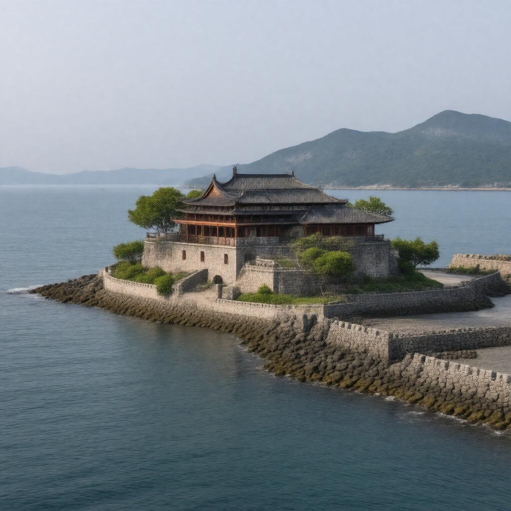 "Generate a realistic image of Kinmen island, a county of Taiwan located in the Taiwan Strait, near Fujian Province. Depict a scenic view of the island with its characteristic granite architecture, possibly with a traditional building or a historic site in the foreground, and the sea or a coastal area in the background. Incorporate elements that reflect the island's military history and cultural significance, such as a military structure or a Kaoliang liquor distillery. The image should convey a sense of the island's unique blend of natural beauty and historical importance."