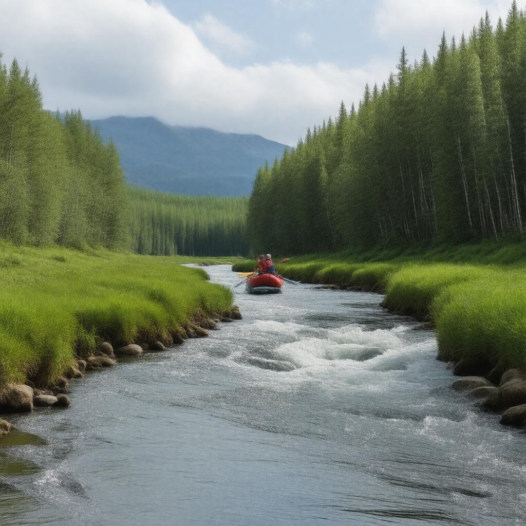 "Generate an image of a serene river flowing through a vast Alaskan wilderness, surrounded by lush greenery and wildlife, with a few rafters in the distance, representing the Kisaralik River in the Yukon Delta National Wildlife Refuge."