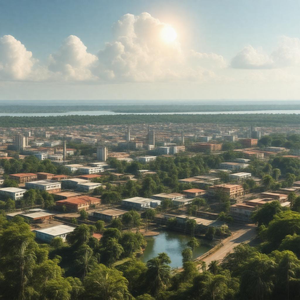 "Generate a realistic image of Kitwe, a city in Zambia's Copperbelt Province, showcasing its vibrant urban landscape with a mix of modern and industrial architecture, surrounded by lush greenery and with the Kafue River in the distance, under a bright subtropical sun, highlighting its rich copper mining heritage and bustling city life."