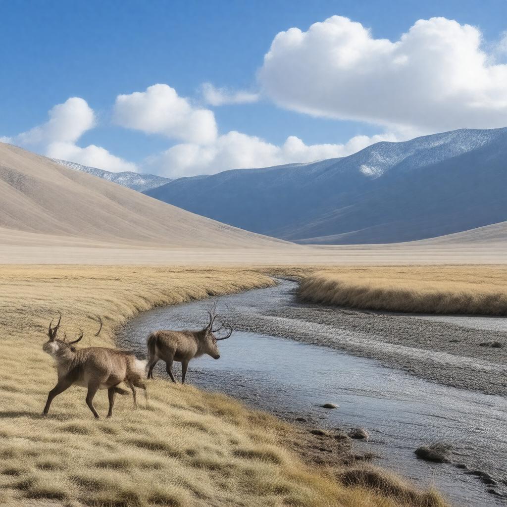 "Generate an image of a vast, untouched wilderness landscape featuring the Great Kobuk Sand Dunes, with the Kobuk River flowing through it, surrounded by the Baird Mountains in the background, under a clear blue sky with a few puffy white clouds, with caribou roaming freely in the foreground, in a realistic and breathtaking style, capturing the essence of a remote and pristine Arctic ecosystem."