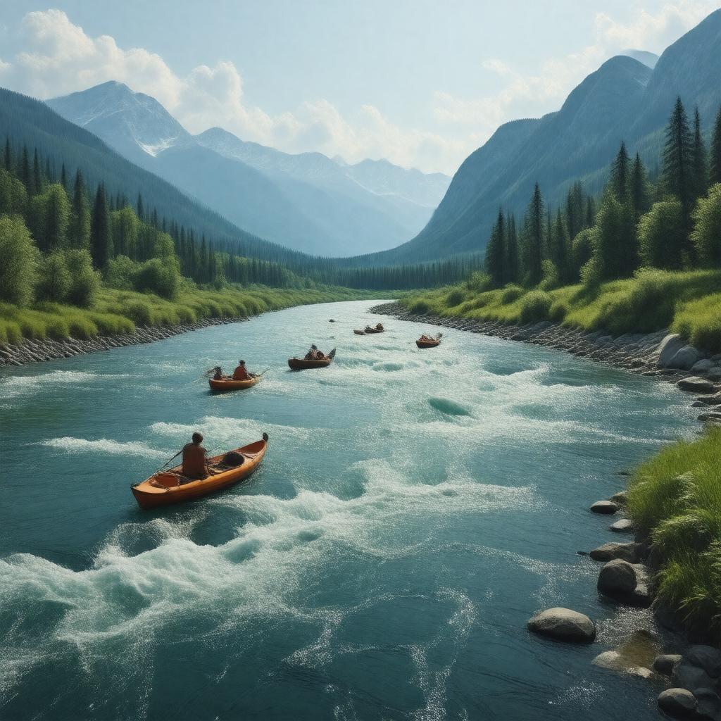 "Generate an image of a serene river flowing through a scenic landscape, surrounded by mountains and lush greenery, with a few boats or kayaks on the water. The river should be depicted in a realistic style, with a gentle flow and a few rapids. In the background, a mountain range with a few peaks and a national park or lake can be seen. The image should represent the Kootenay River, a 781 km long river located in Canada and the United States, flowing through British Columbia, Montana, and Idaho, and should include some of its notable features such as Kootenay Lake, Kootenay National Park, or Libby Dam."