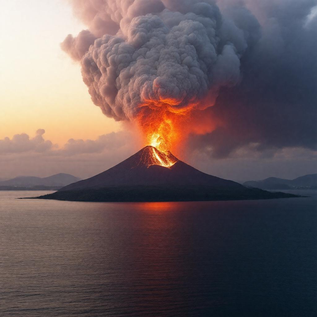 "Generate an image of a dramatic volcanic landscape at dusk, featuring the volcanic island of Krakatoa with Anak Krakatau in the foreground, surrounded by sea and with a massive ash cloud rising from the volcano, set against a backdrop of a fiery orange and pink sky, with the Sunda Strait and surrounding islands visible in the distance."