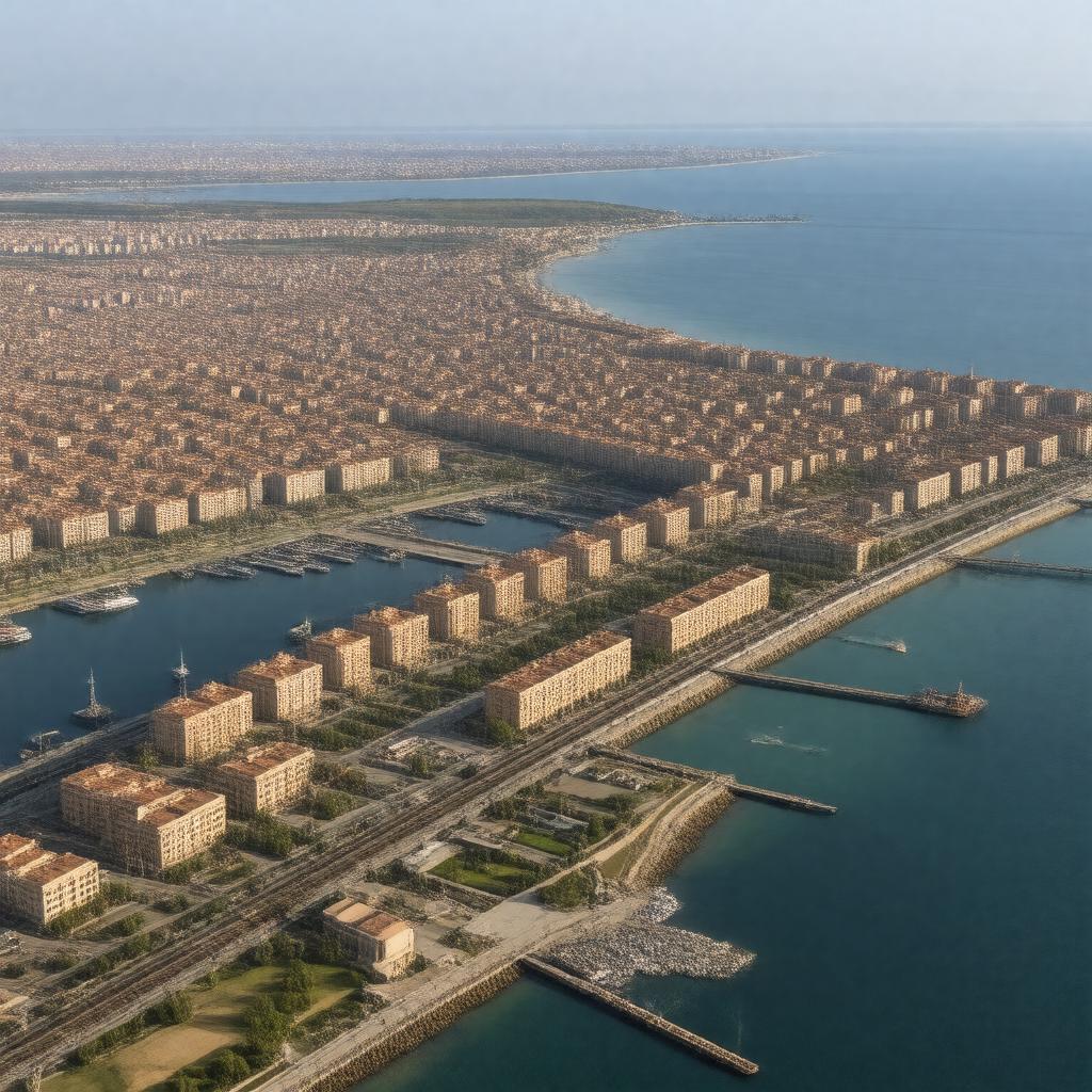 "Generate a realistic image of a coastal city located on the Caspian Sea in Balkan Province, Turkmenistan, with a port and a railway terminus, depicting the cityscape of Türkmenbaşy, formerly known as Krasnovodsk, founded in 1869, with a blend of Soviet-era and modern architectural styles."