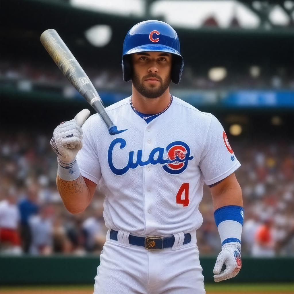 Generate an image of Kris Bryant, a professional baseball player, in his Chicago Cubs uniform, standing confidently at bat with his helmet and bat, showcasing his impressive physique, with a blurred background of Wrigley Field, in a realistic and action-packed style.