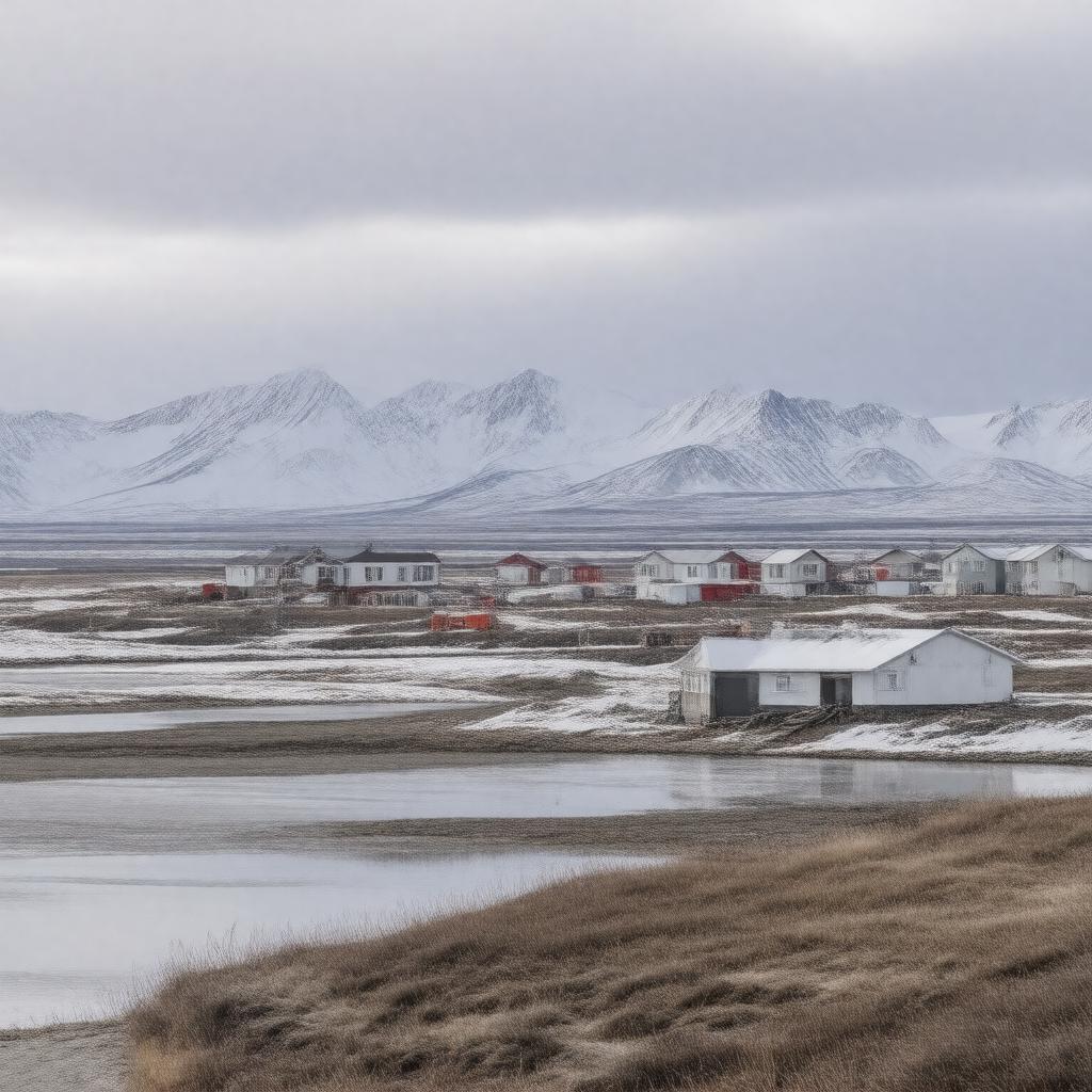 "Generate a realistic image of Kugluktuk, a small hamlet located on the shores of Coronation Gulf in Nunavut, Canada, showcasing its Arctic landscape, possibly with traditional Inuit buildings, and a backdrop of snow-capped mountains and icy waters, under a vast, possibly cloudy sky."