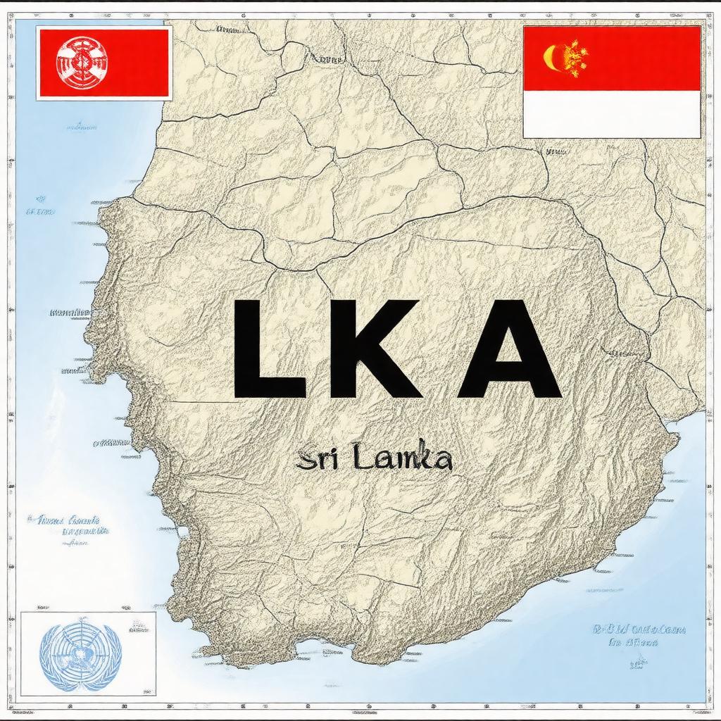 Generate an image of the ISO 3166-2 code "LKA" on a map of Sri Lanka, with the country's outline and borders prominently displayed, and a small inset of the international standard document or a United Nations flag in the corner, symbolizing its usage in international standards and by global organizations.