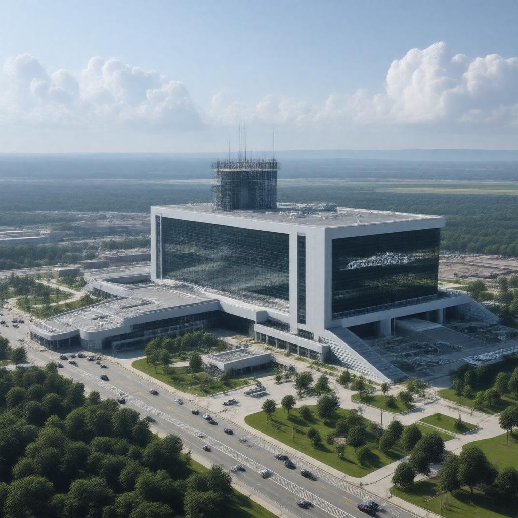 "Create a realistic image of the Lockheed Martin company headquarters, located in Bethesda, Maryland, United States, with a futuristic aerospace or defense-related background, incorporating subtle hints at the company's notable products, such as aircraft, missile systems, or space systems."