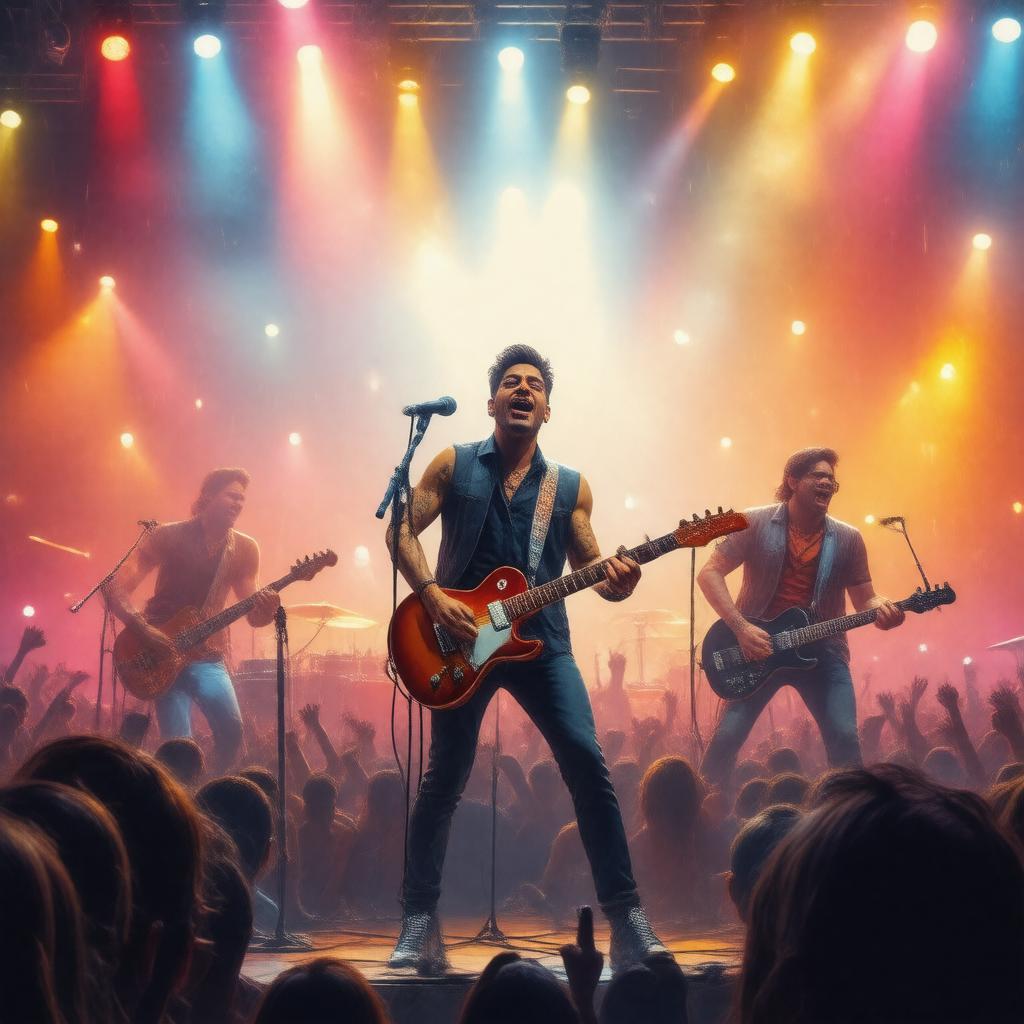 Generate an image of a rock band from India, active in the 2010s, performing on stage with a energetic crowd in the background, in a vibrant and dynamic style, with bold colors and expressive lighting, representing the musical group LOG.