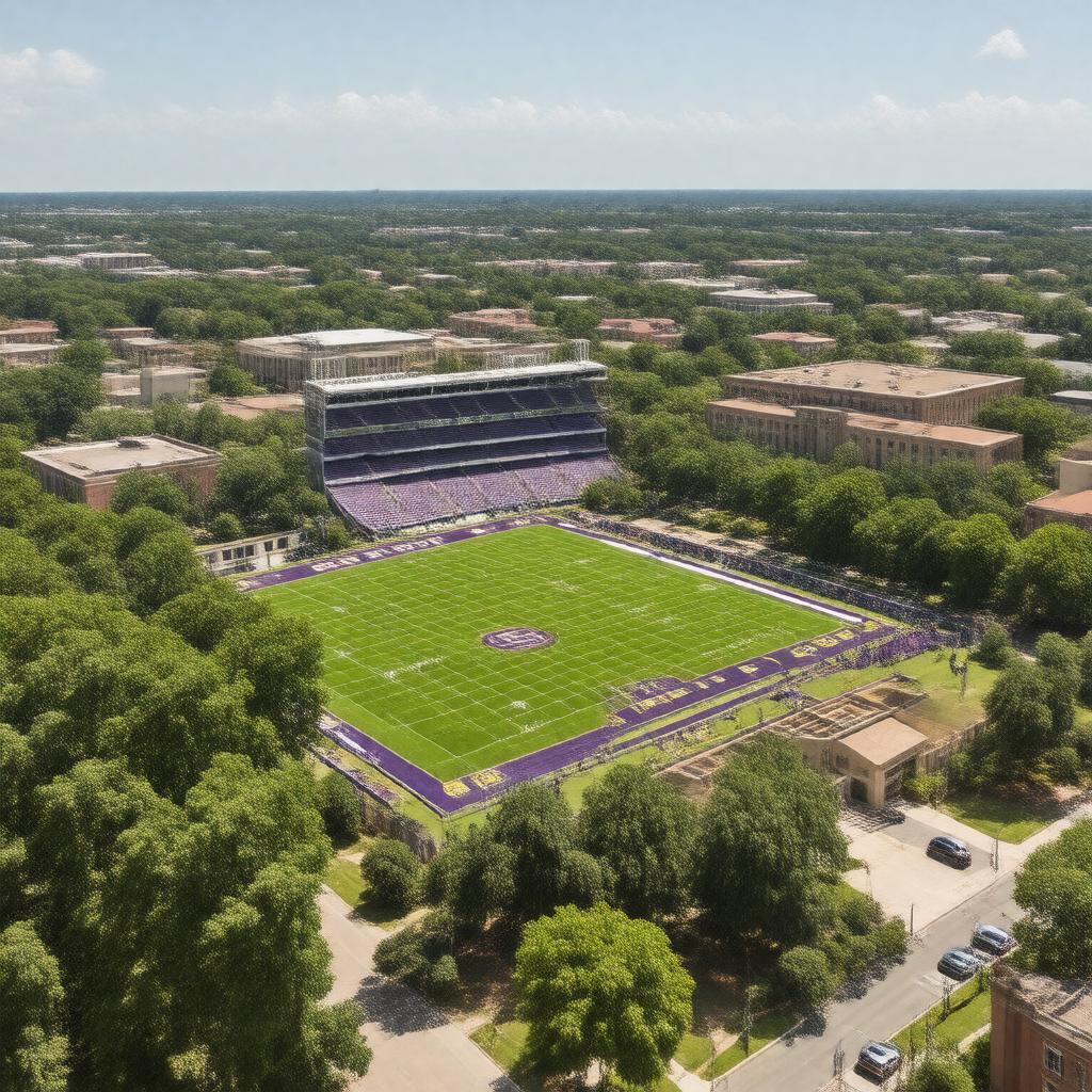 "Generate an image of the Louisiana State University (LSU) campus, featuring the iconic Tiger Stadium and surrounded by lush greenery, with a mix of modern and historic buildings in the background, under a bright sunny sky with a subtle hint of purple and gold colors, symbolizing the university's spirit and motto 'Scholarship, Leadership, Service, Opportunity'."