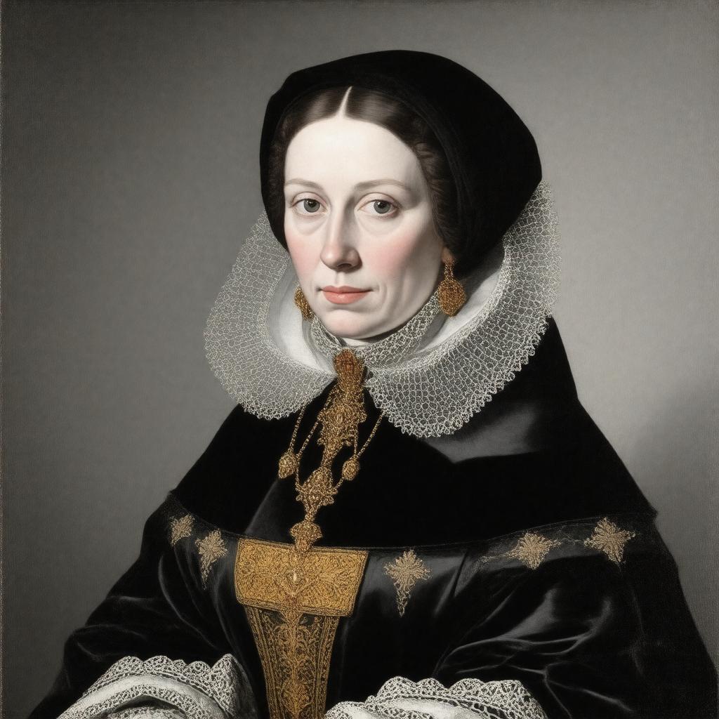 "Create a realistic portrait of Lady Margaret Beaufort, a noblewoman from the Late Middle Ages, dressed in formal attire fitting for her title as Countess of Richmond and Derby, set against a backdrop that subtly suggests her connection to Westminster Abbey, where she was buried, and including elements that reflect her philanthropic and educational contributions, such as a book or a symbolic representation of her founding of Christ's College, Cambridge, or St John's College, Cambridge."