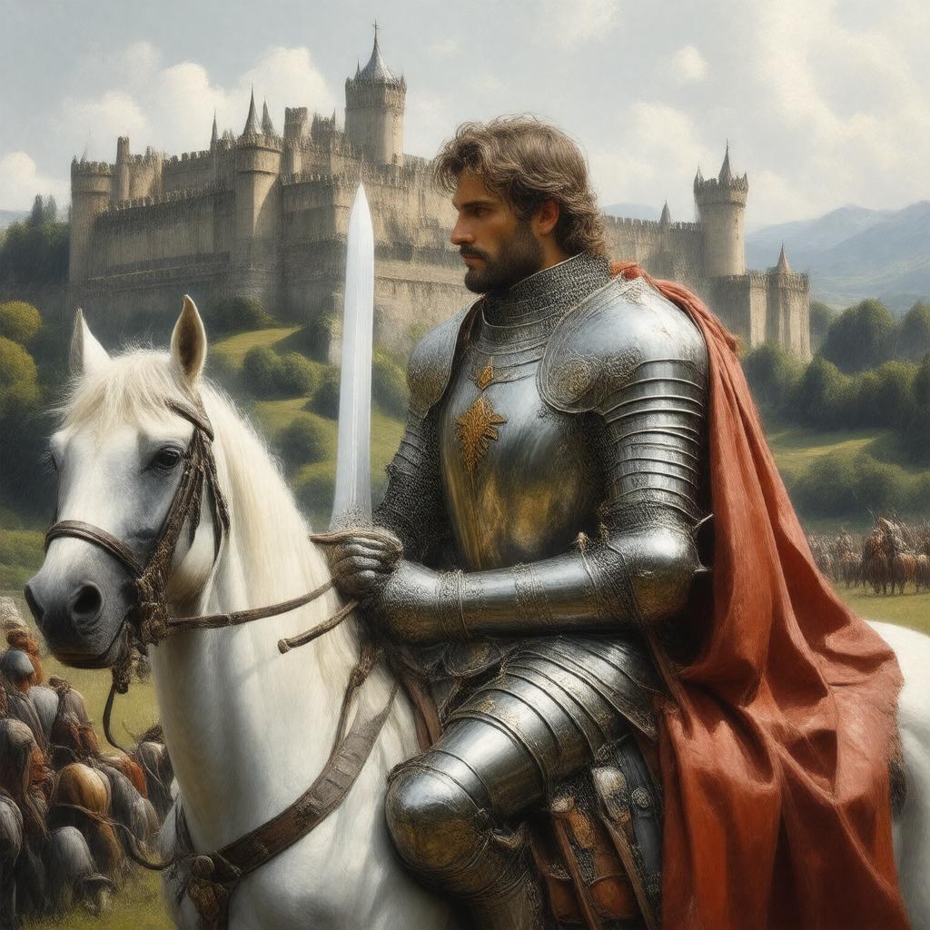 Generate an image of a chivalrous knight in shining armor, sitting on a horse, holding a sword, with a backdrop of Camelot castle, representing Lancelot, a legendary character from the Arthurian era, known for his bravery and noble deeds, particularly his quest for the Holy Grail and his romance with Queen Guinevere. Style: Realistic with a touch of medieval illustration.