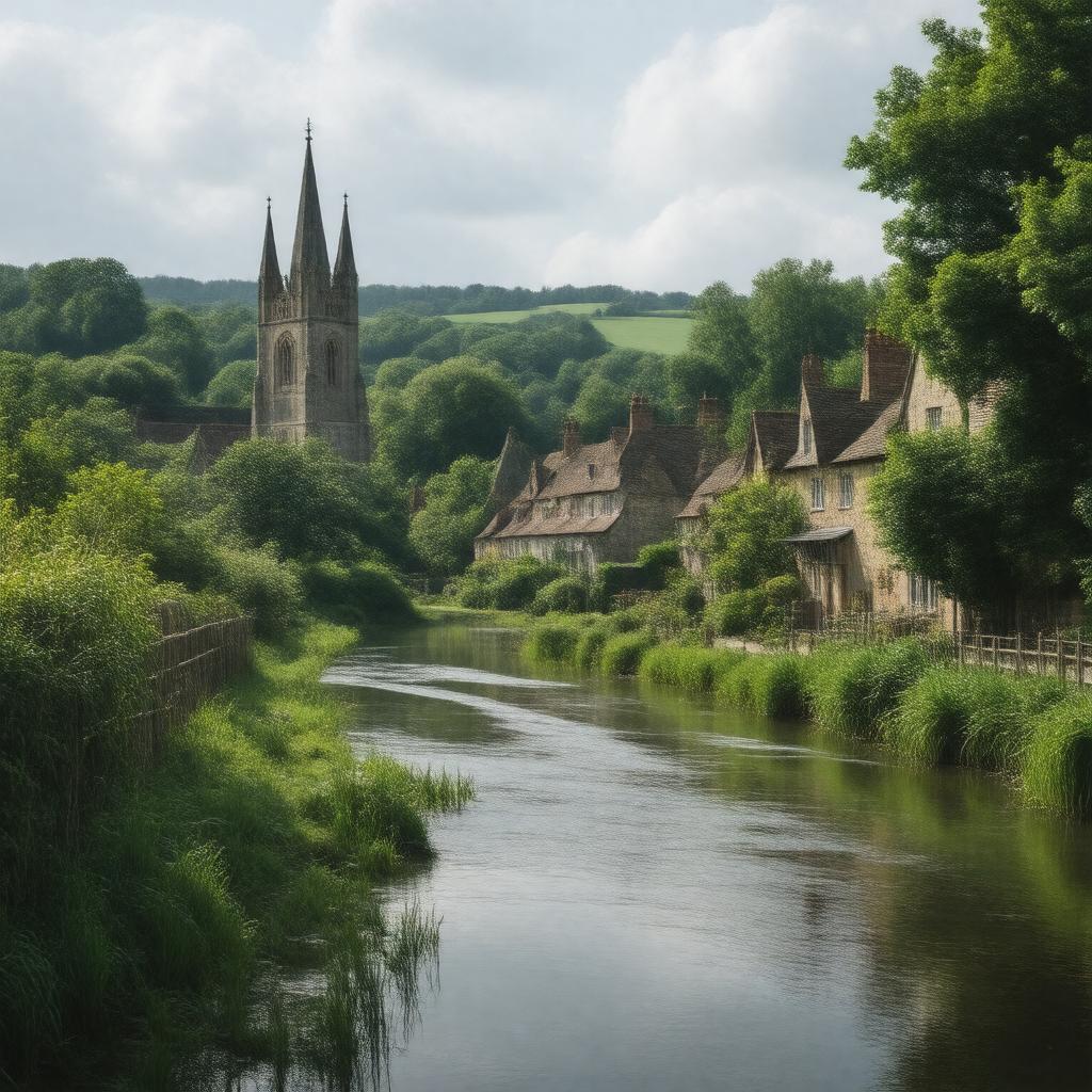 "Generate an image of a charming town in the English countryside, with historic buildings and a river running through it. The town, named Langport, should be depicted in a realistic style, with a church steeple and a notable old chapel visible in the scene. The River Parrett should be shown flowing gently through the town, with lush greenery and trees lining its banks. The image should evoke a sense of tranquility and small-town charm, with a hint of history and tradition."