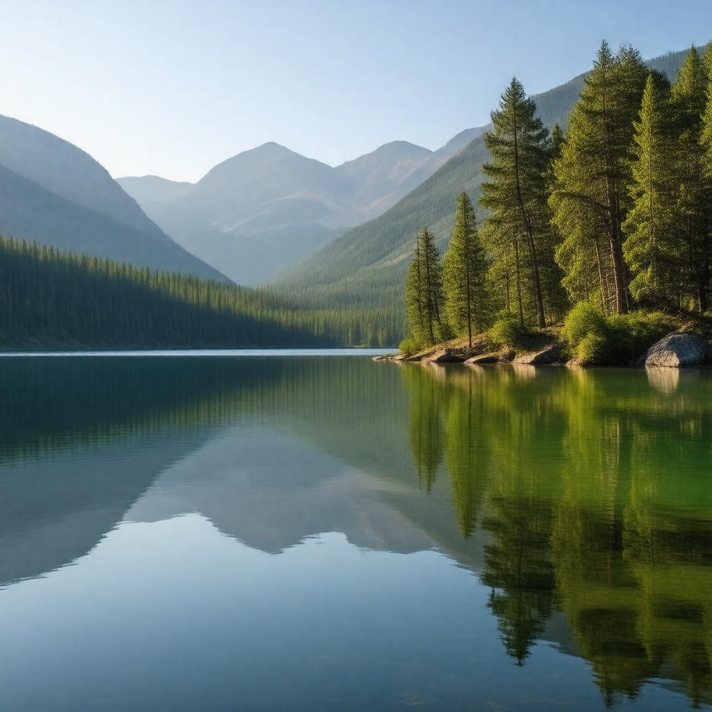 "Generate a serene and picturesque image of Laughing Lake, a tranquil lake situated in Glacier National Park, Montana, United States. The image should capture the lake's calm waters reflecting the surrounding mountains and lush greenery, with a few trees lining its shores. The style should be realistic and reminiscent of a nature photograph, with warm sunlight casting a gentle glow on the scene."