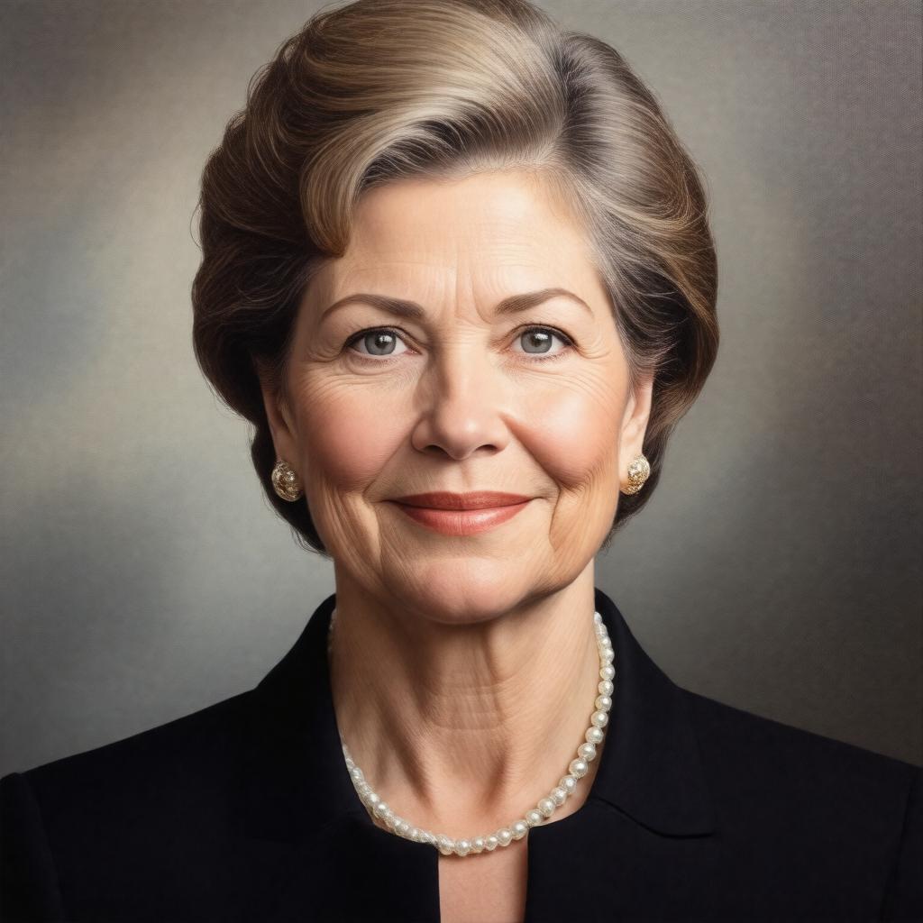 "Generate a realistic portrait of Laura Bush, former First Lady of the United States, in a warm and elegant setting, reflecting her personality and style, with a subtle background that hints at her love for literature and education."