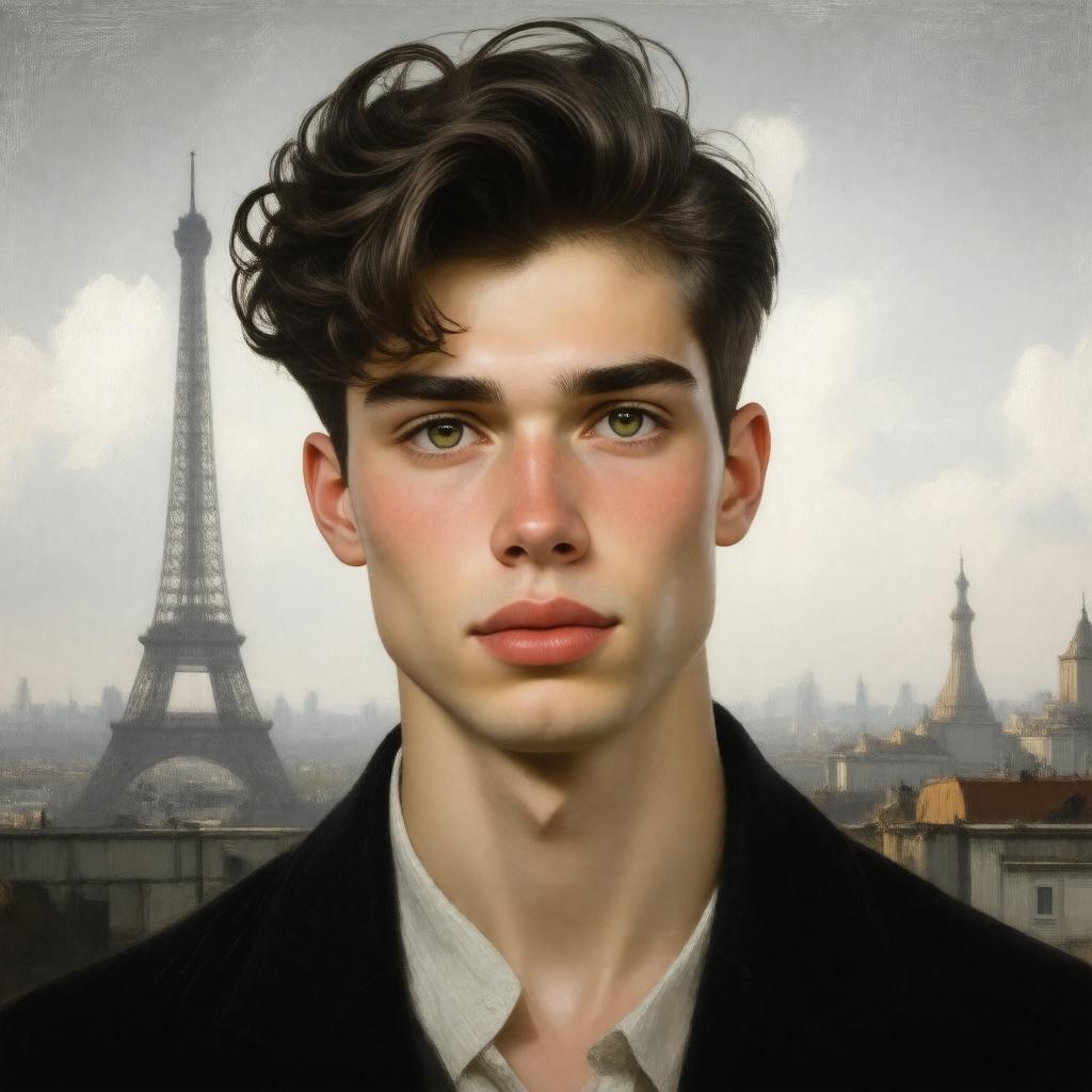 Generate a realistic image of a young French man with a strong, gentle face, representing the given name Laurent, with a subtle background hinting at French culture, such as a soft image of the Eiffel Tower or a French landscape, in a classic, elegant style reminiscent of French portraiture.