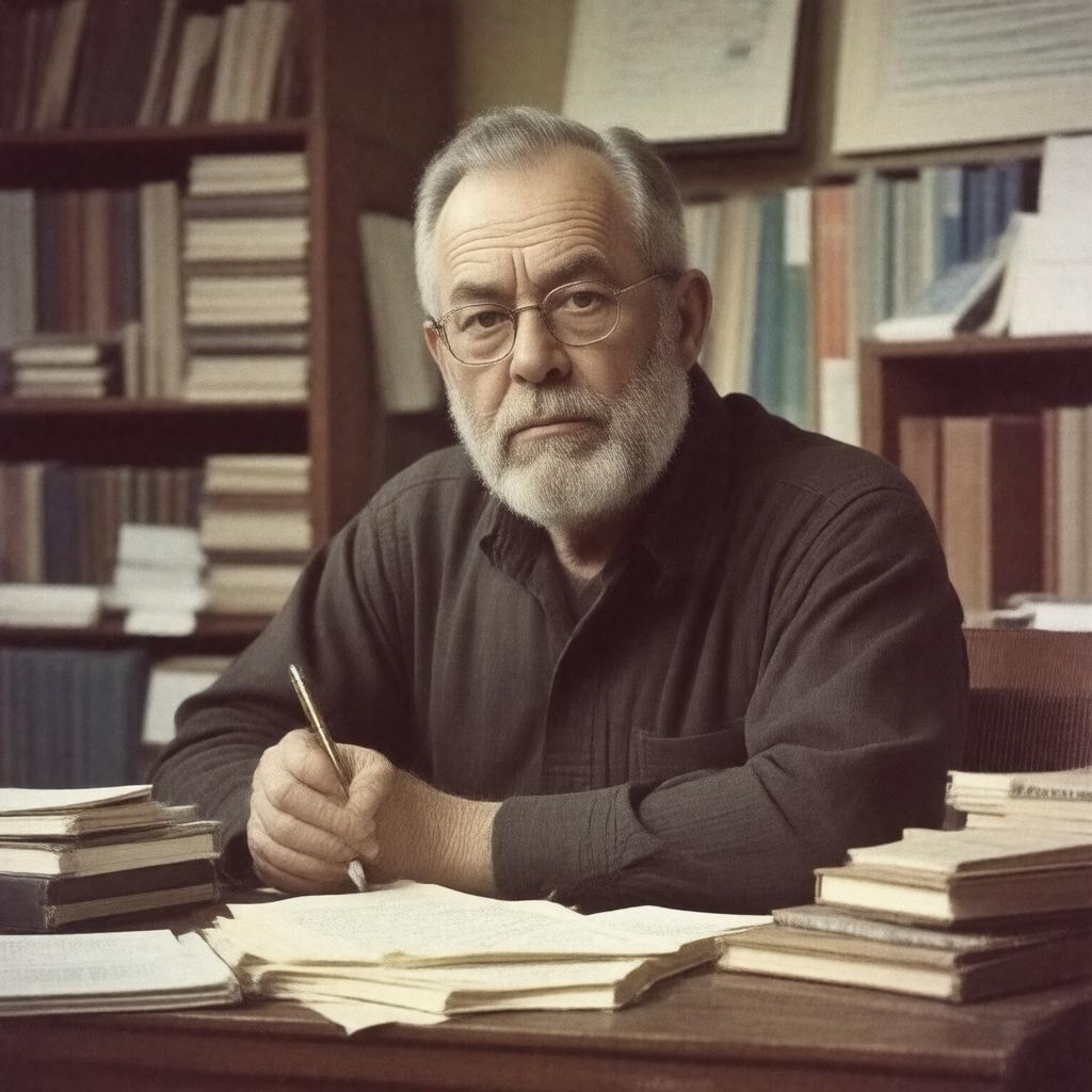 "Generate a realistic portrait of Lawrence Block, an American novelist and short story writer, sitting at a desk with papers and books scattered around him, with a pen in hand and a thoughtful expression on his face, in a style reminiscent of a classic author photograph, with a muted color palette and a hint of nostalgia."