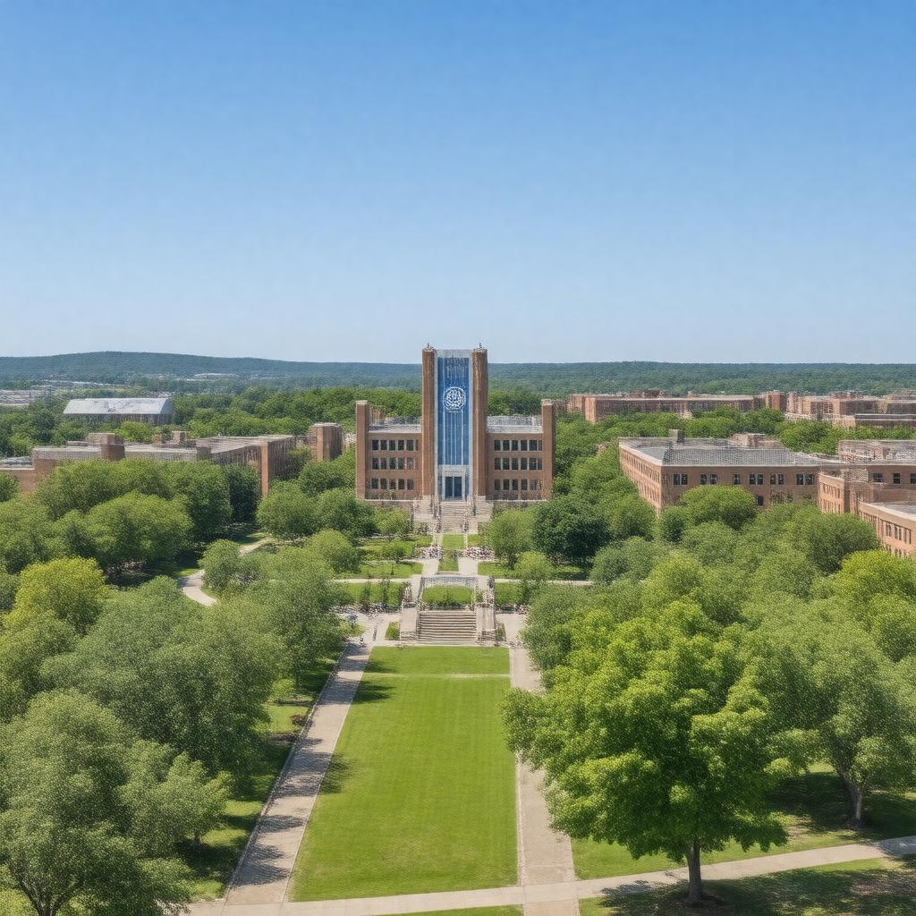 "Generate an image of a scenic view of Lawrence University's campus, showcasing its urban setting in Appleton, Wisconsin, with a mix of modern and historic buildings, including the iconic concert hall and Seeley G. Mudd Library, surrounded by lush greenery and vibrant blue and white accents reflecting the school's colors, with a subtle hint of Viking symbolism, under a bright and sunny sky with the motto 'Light! More Light!' prominently displayed."