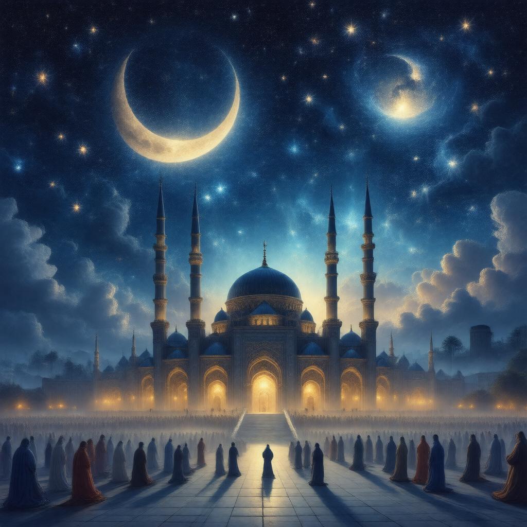 "Generate an image of a serene and majestic night scene, representing Laylat al-Qadr, the Night of Power, with a dark blue or purple sky filled with stars, a crescent moon shining bright, and a mosque or a Islamic architecture in the foreground, surrounded by people in peaceful prayer, Quran recitation, and contemplation, conveying a sense of spirituality, reverence, and devotion."