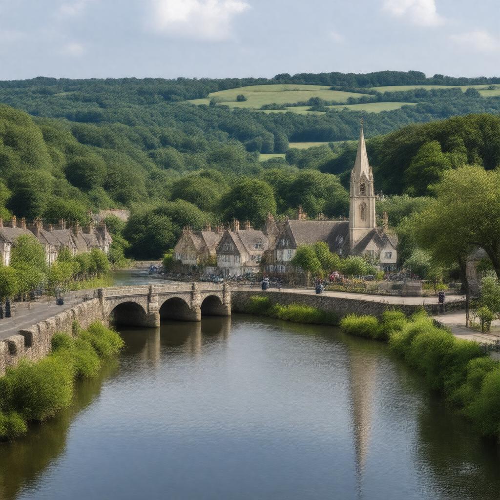 "Generate an image of a charming town situated on the River Thames in Gloucestershire, England, featuring St Lawrence's Church and Halfpenny Bridge, with a backdrop of rolling hills and lush greenery, in a realistic and picturesque style."