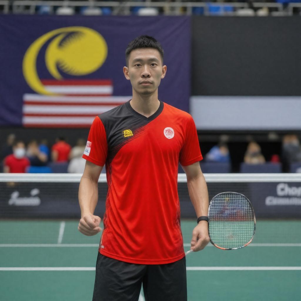 "Generate a realistic image of Lee Chong Wei, a renowned Malaysian badminton player, in his signature playing attire, standing confidently on a badminton court with a racket in hand, conveying his determination and focus during a match, with a subtle Malaysian flag in the background."