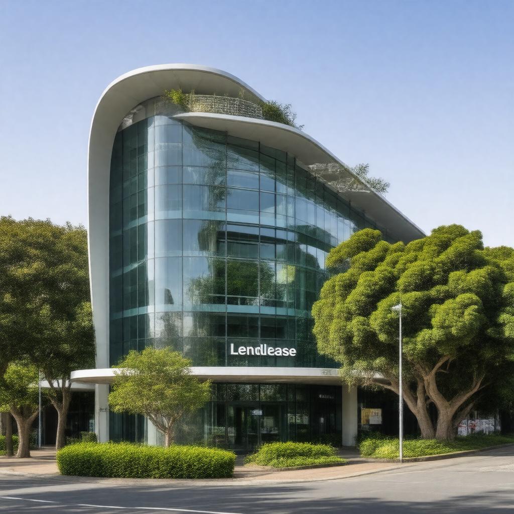"Generate a professional and modern image of the Lendlease Group headquarters in Sydney, Australia, with a sleek and contemporary architectural style, surrounded by lush greenery and featuring the company's logo prominently displayed on the building's facade, symbolizing the company's presence in the construction, property development, and investment management industries."