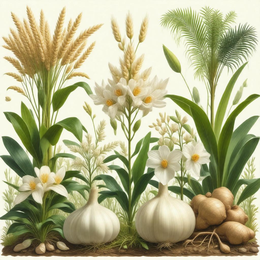"Generate an image of a diverse group of flowering plants, including a rice plant, a wheat plant, a maize plant, a banana tree, an orchid, a garlic plant, and a ginger plant, all arranged together to represent the Liliopsida class, also known as monocots, showcasing their characteristic parallel leaf venation, flowers in multiples of three, and fibrous root systems, in a lush and vibrant natural setting."