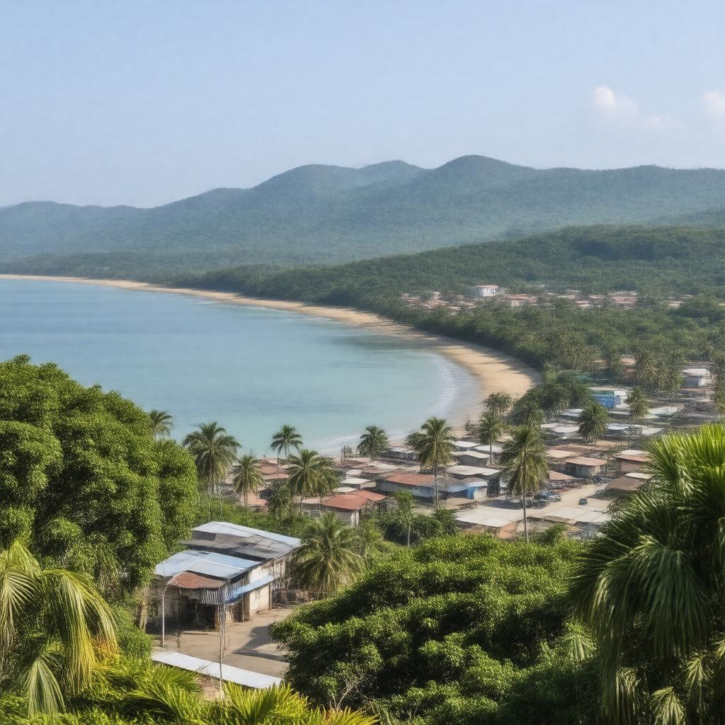 "Generate a realistic image of a coastal municipality in the Philippines, specifically Limay, Bataan, with a scenic view of its town proper and surrounding landscape, incorporating tropical trees and possibly industrial or beach areas, reflecting its location in Central Luzon, in a daytime setting with clear skies."