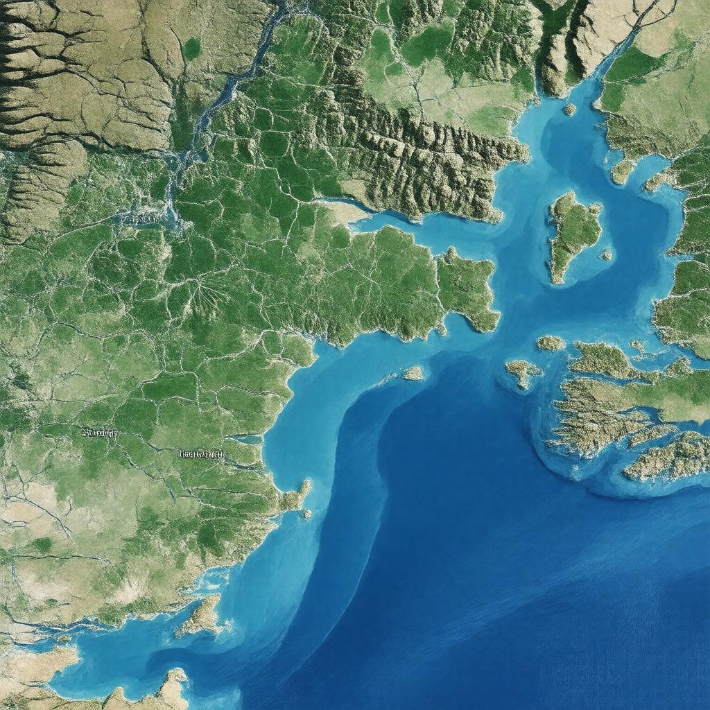 "Generate a realistic image of Liverpool Bay, a bay located in the Irish Sea, northwest England, near Liverpool, Wirral Peninsula, and North Wales. The bay should depict the mouths of River Mersey, River Dee, River Ribble, and River Alt flowing into it. Include the Port of Liverpool, Burbo Bank Offshore Wind Farm, and Gwynt y Môr Offshore Wind Farm in the scene. In the background, show the Liverpool Bay oil and gas field. The image should convey ecological concerns of water pollution and eutrophication. Include shipping routes from Liverpool to Dublin and Liverpool to Isle of Man. The style should be a daytime seascape with a realistic representation of the bay's geography and features."