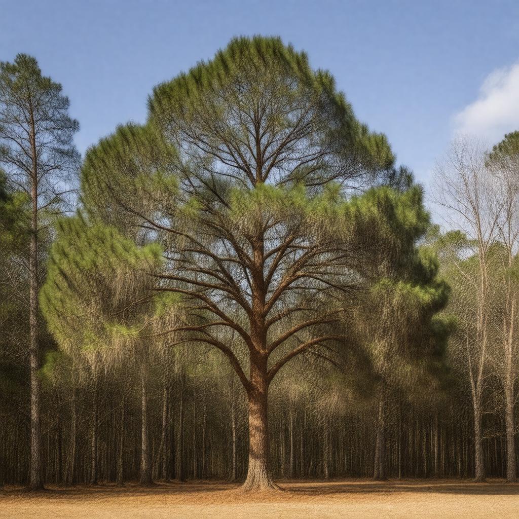 "Generate a realistic image of a mature Loblolly pine (Pinus taeda) tree standing tall in a forest, with a reddish-brown trunk and branches adorned with fascicles of three needle-like leaves, set against a backdrop of a sunny day in the Southeastern United States, with a subtle hint of a forest floor teeming with wildlife, in a style that reflects the natural and serene environment of this iconic tree species."