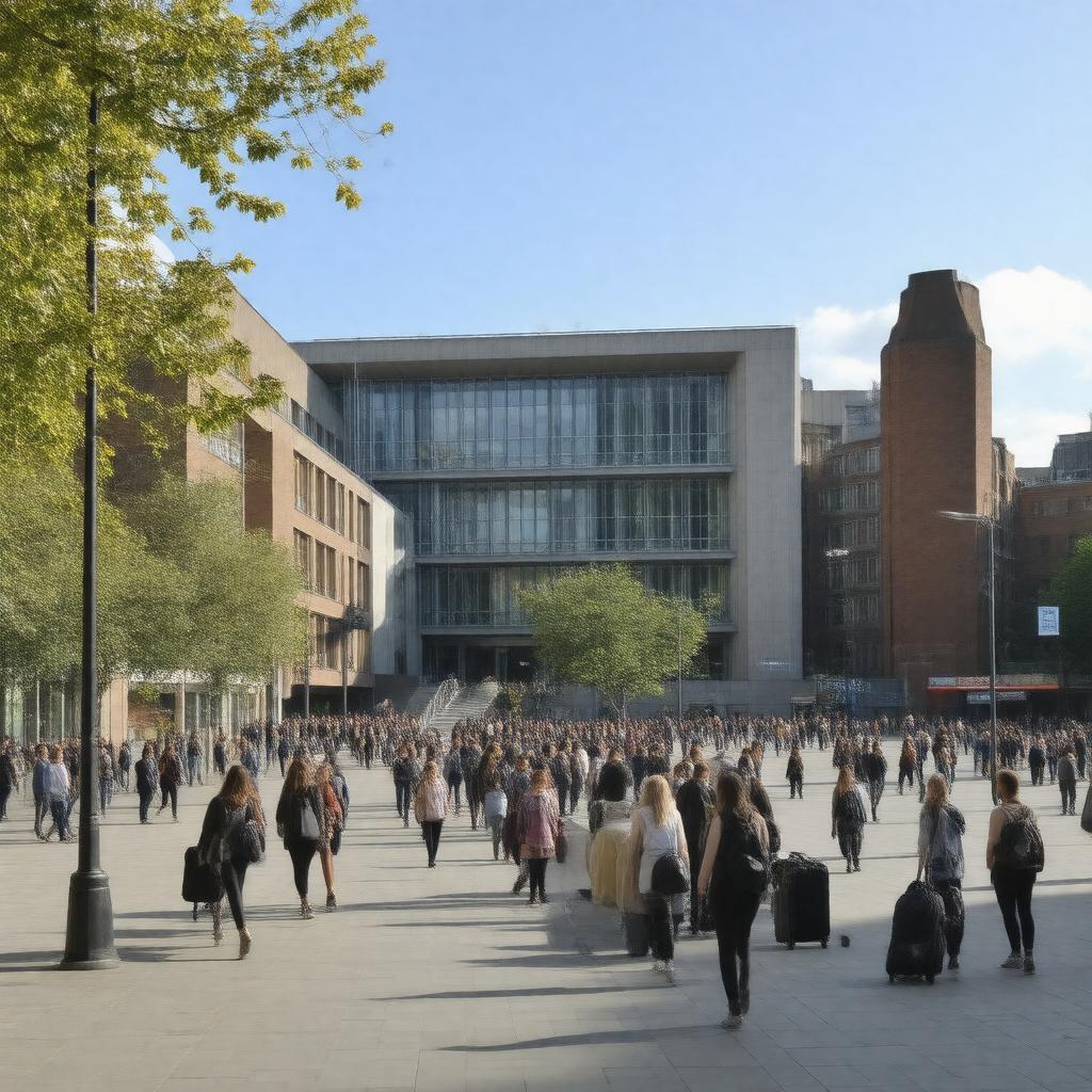 "Generate an image of the London Metropolitan University, a public university located in London, United Kingdom, showcasing its modern architecture and bustling campus life, possibly with students walking around, with a mix of its Holloway Road, Aldgate, and Moorgate campuses in the scene, under a clear blue sky."