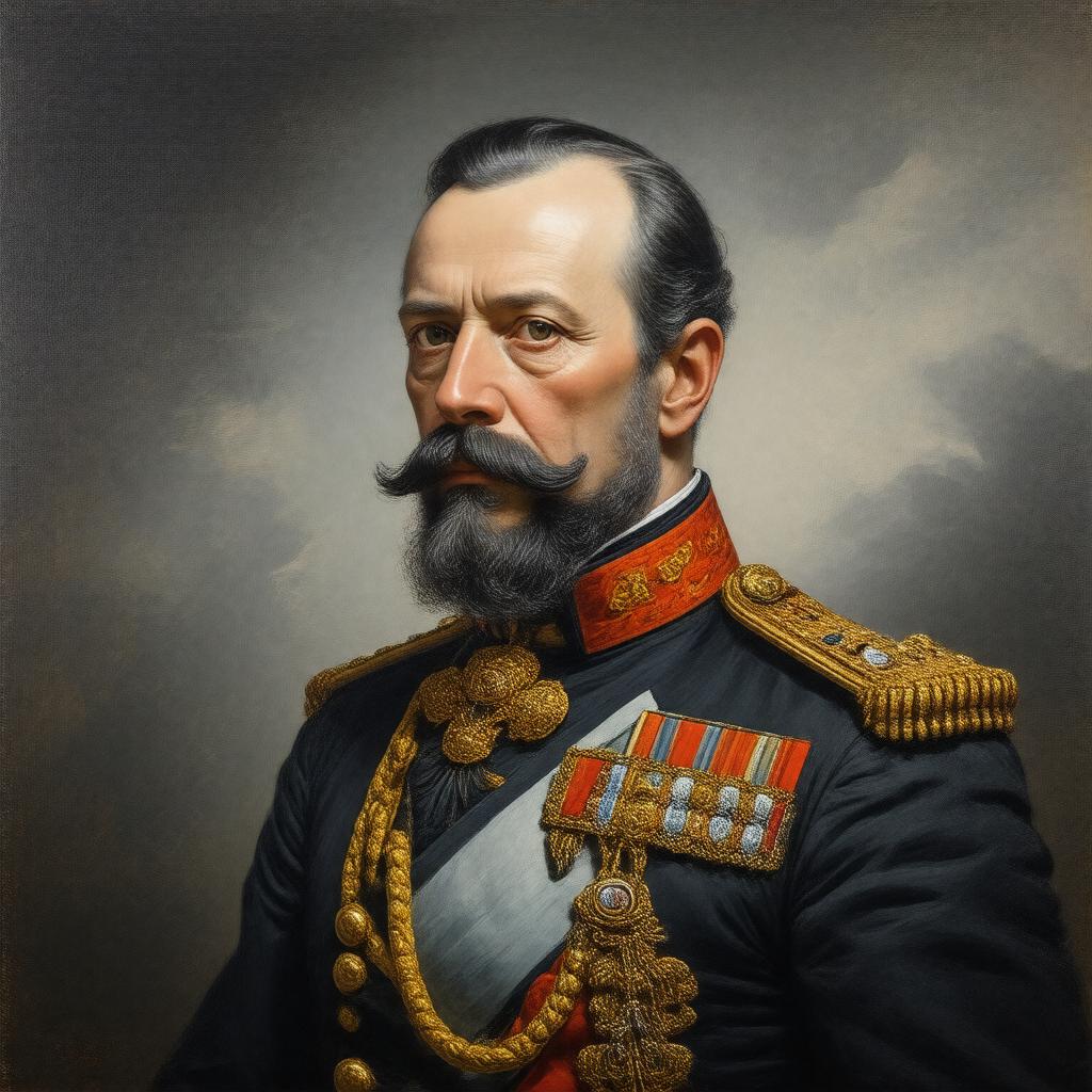 "Generate a realistic portrait of Louis-Napoléon Bonaparte, also known as Napoleon III, in a formal attire befitting his title as King and Emperor, standing in a dignified pose with a subtle background that hints at his imperial legacy, in the style of a 19th-century oil painting."