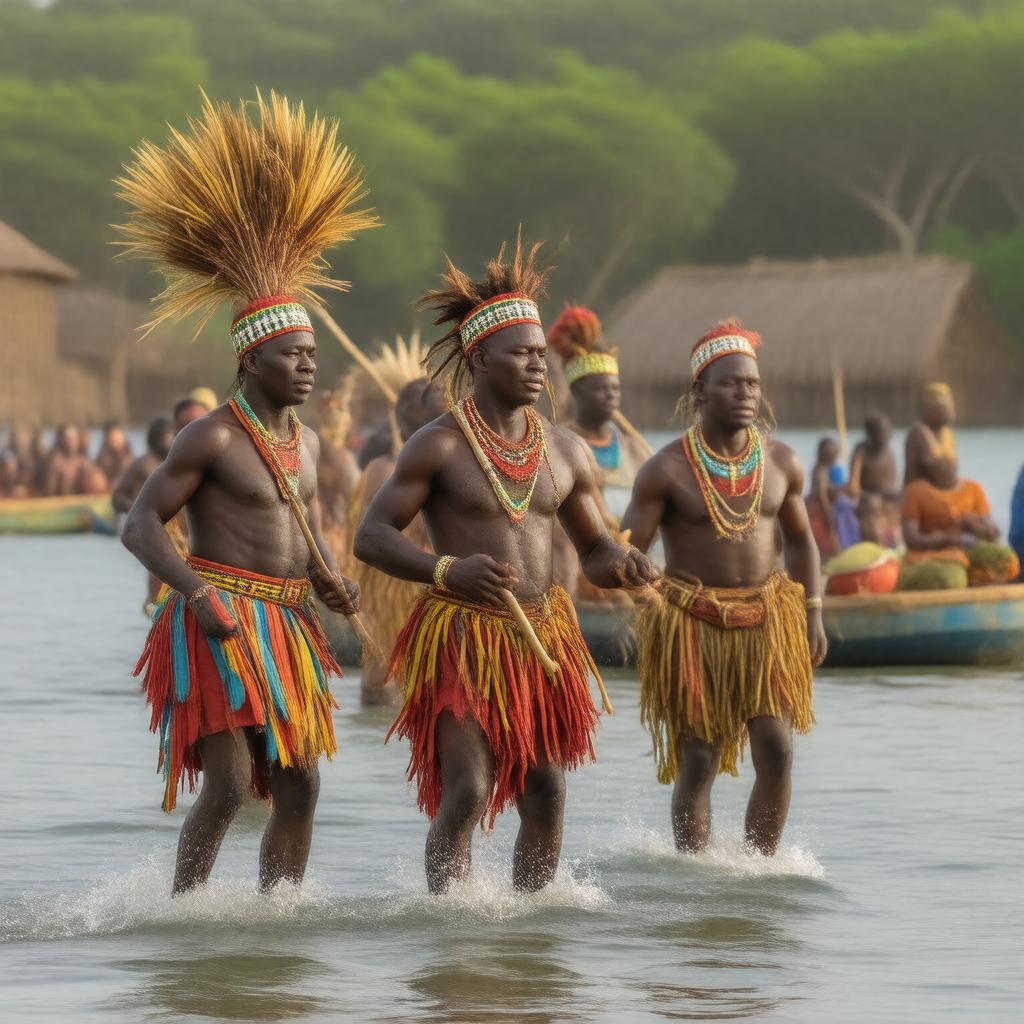 "Generate an image of a vibrant Luo cultural festival on the shores of Lake Victoria in Kenya, with a backdrop of lush greenery and traditional Luo huts, featuring people dressed in colorful traditional attire, playing musical instruments like Benga, and engaging in lively celebrations, with a few fishing boats and agricultural produce on display, reflecting the community's rich heritage and traditions."