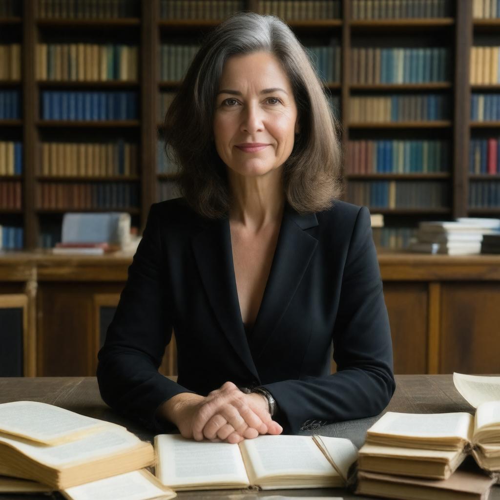 Create a realistic portrait of Lynn Vavreck, a middle-aged American woman with a professional demeanor, sitting in a university setting, surrounded by books and academic papers, wearing attire suitable for a professor at a prestigious institution like UCLA, reflecting her occupation as a political scientist and professor, with a subtle background hinting at her notable works such as "The Gamble," "Identity Crisis," and "The Message Matters."