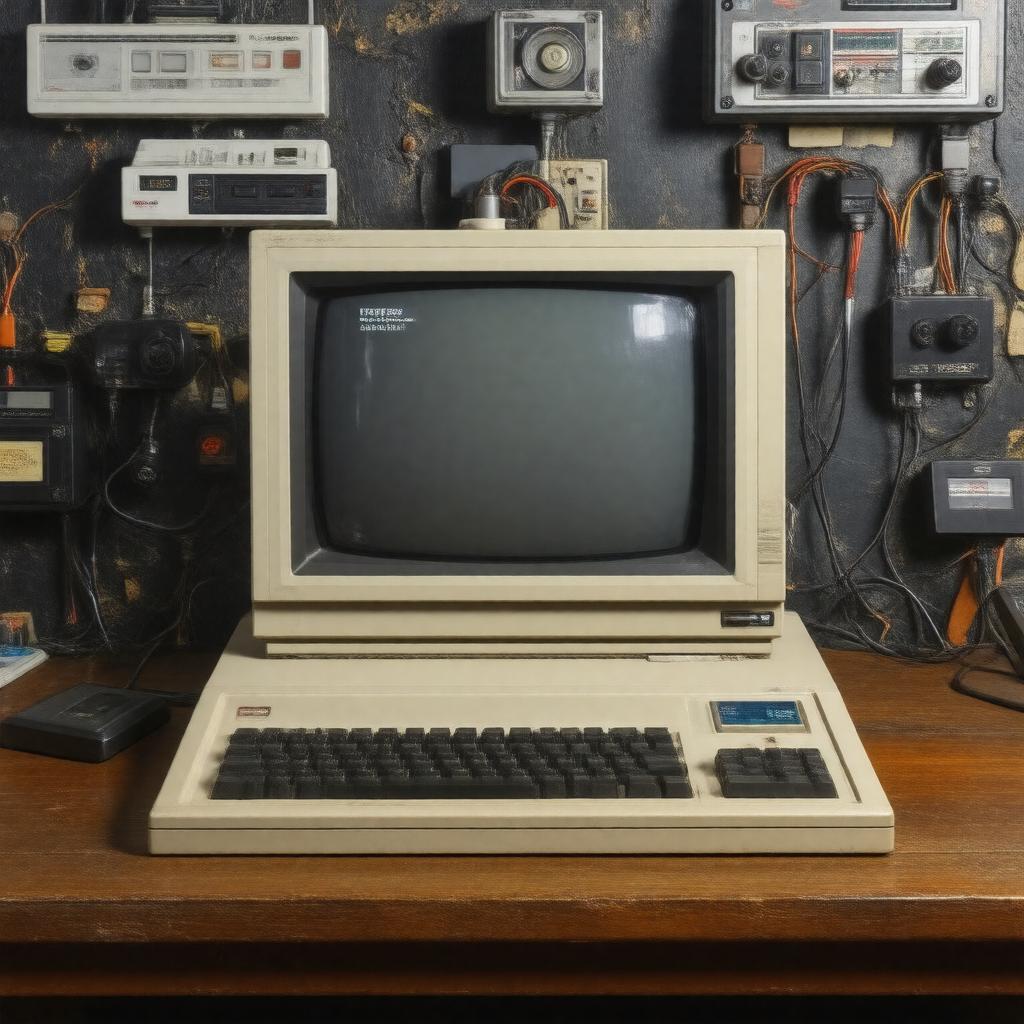 "An 8-bit MSX home computer from 1983 with a Zilog Z80 processor, 32 KB of RAM, and a Texas Instruments TMS9918 GPU, with a cartridge slot and cassette tape interface, running Metal Gear on its screen, set against a nostalgic 80s electronics background."