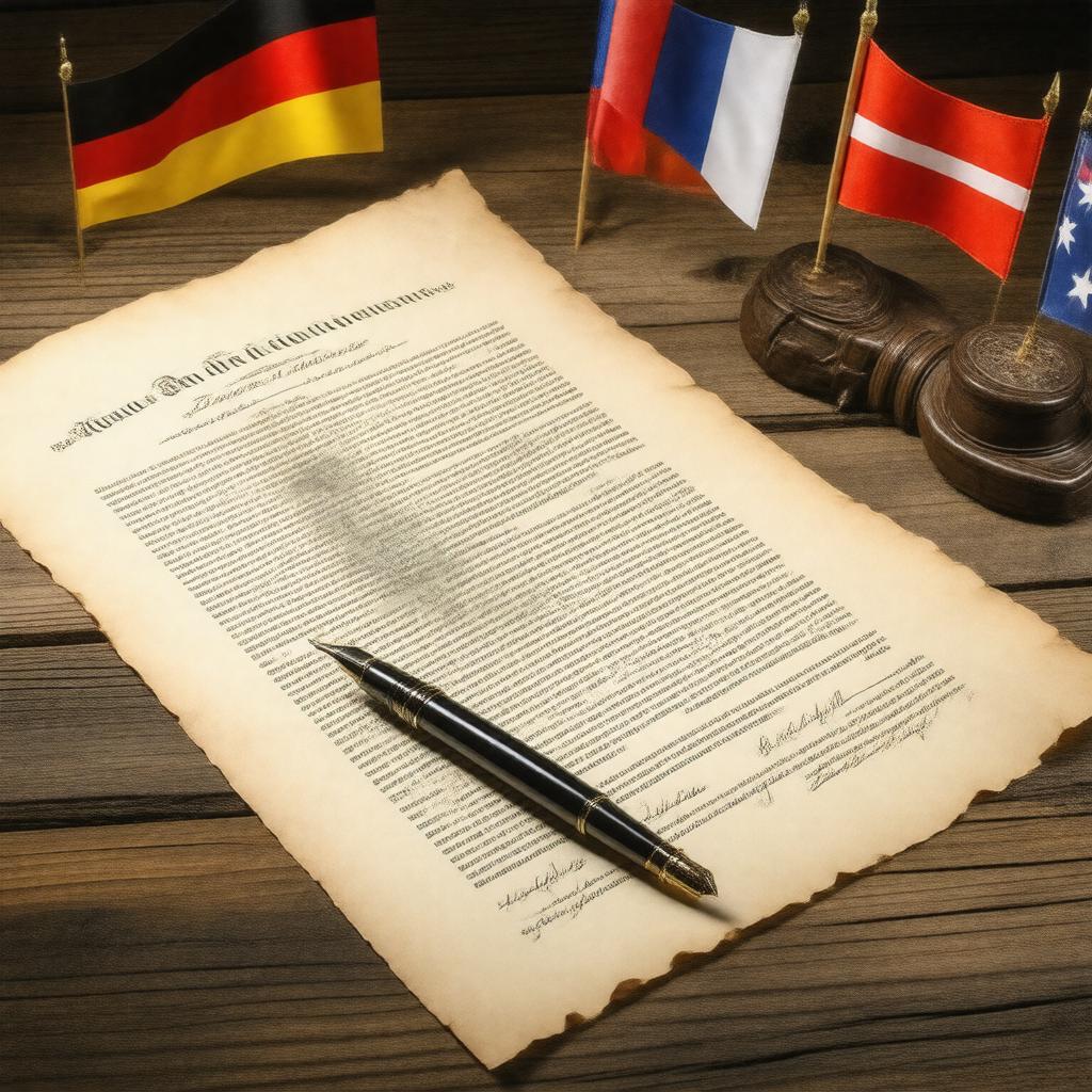 "Create an image of a historic document, specifically a treaty, with a formal and official tone. The document should be displayed on a wooden table or a similar surface, with a few flags of European countries in the background. The flags should include those of the countries that signed the treaty, such as Belgium, France, Germany, and the Netherlands. The document should have a few pages turned over, revealing the text of the treaty in multiple languages, including English, French, German, and Dutch. In the foreground, there should be a quill pen or a fountain pen lying next to the document, symbolizing the signing of the treaty. The overall style should be reminiscent of a 19th-century illustration, with warm colors and detailed textures. The image should convey a sense of importance, unity, and cooperation among European nations."