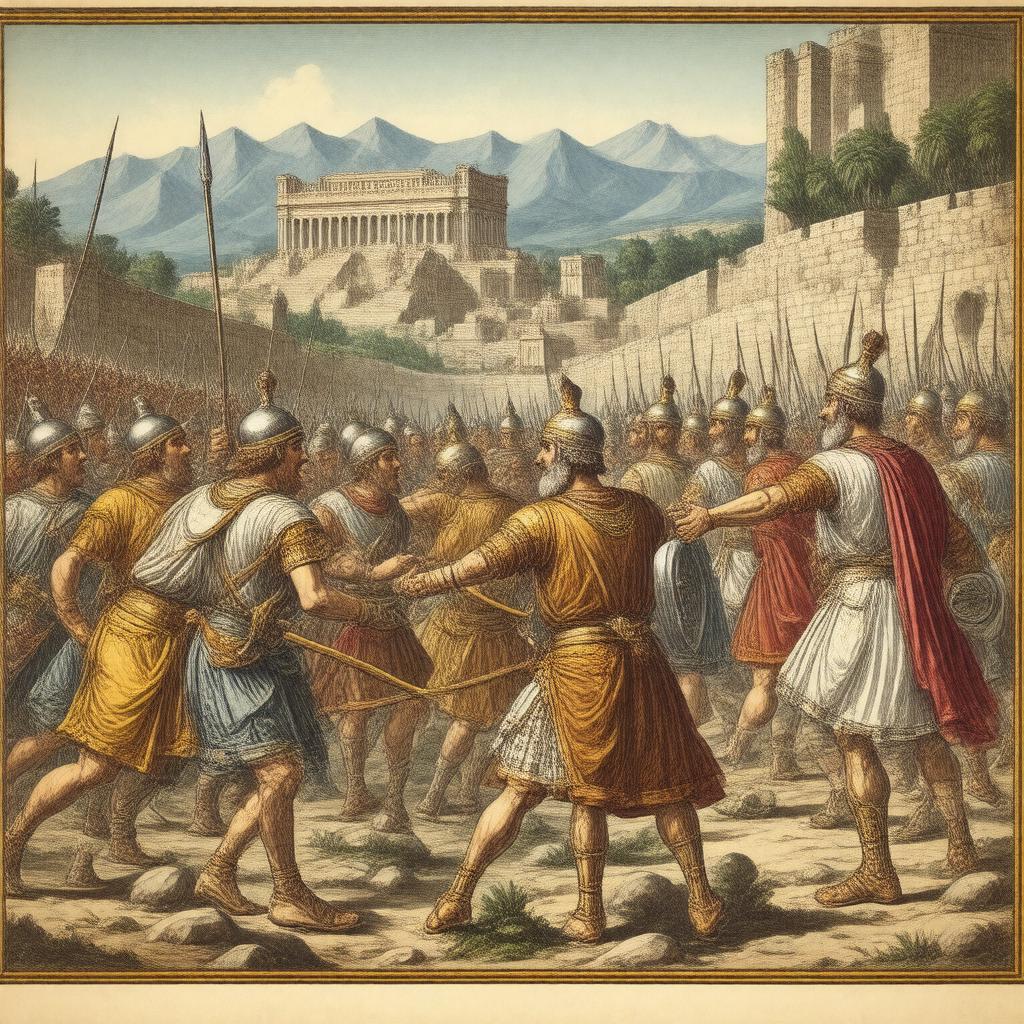 "An ancient illustration of a pivotal battle scene during the Maccabean Revolt, showcasing Jewish rebels led by Judas Maccabeus, Mattathias, and other Maccabean leaders, fighting against the Seleucid Empire forces, with the Judean landscape and the Second Temple in the background, in a style reminiscent of ancient Jewish manuscripts, such as the Books of the Maccabees."