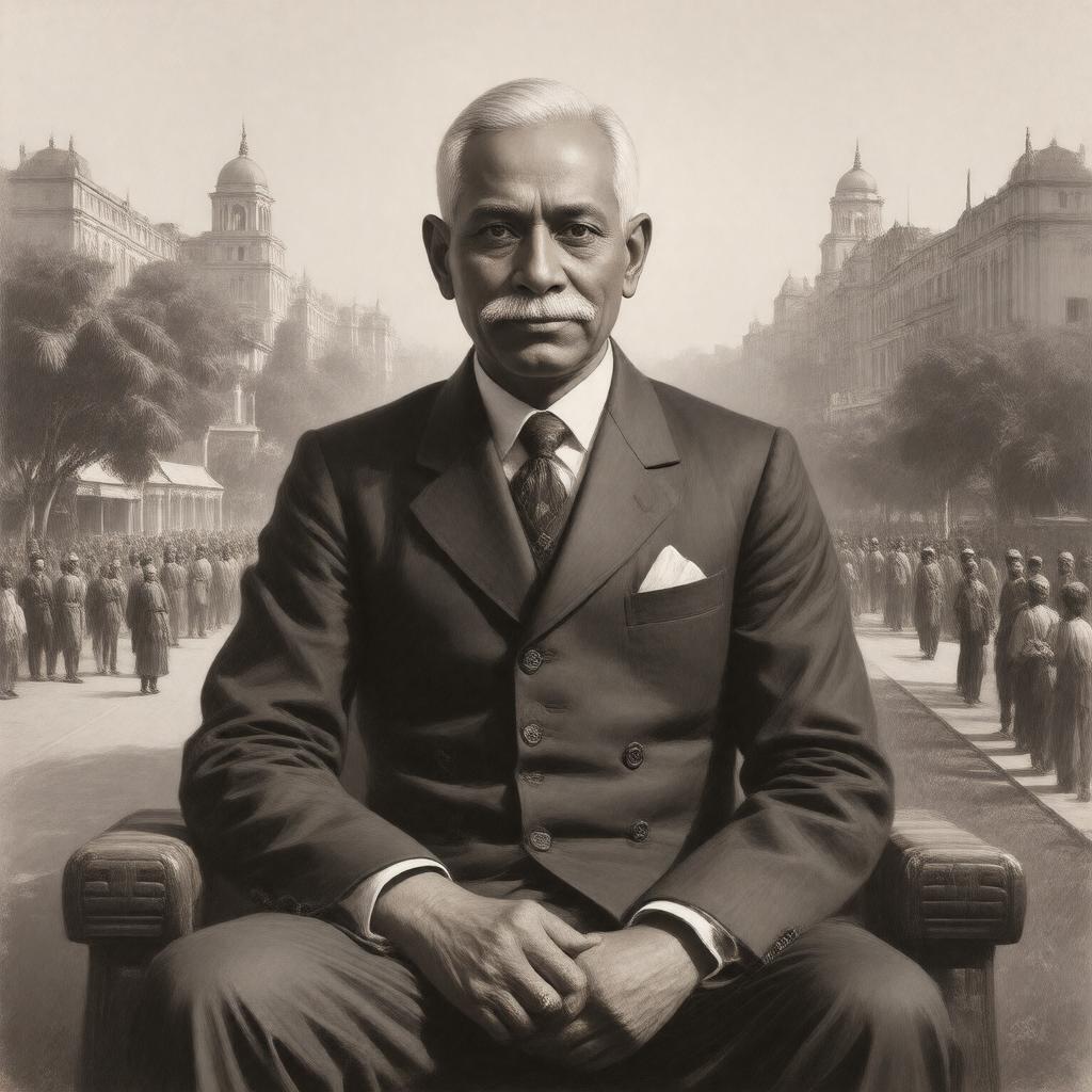 Create an image of Madan Mohan Malaviya, an Indian educator, lawyer, and politician, in a formal attire, sitting in a dignified pose, with a backdrop of the Banaras Hindu University or a Indian National Congress setting, reflecting his contributions to Indian education and independence, with a warm and inspiring expression, in a style that blends traditional Indian and British colonial-era portraiture, symbolizing his role as a bridge between cultures and his nickname "Mahamana".