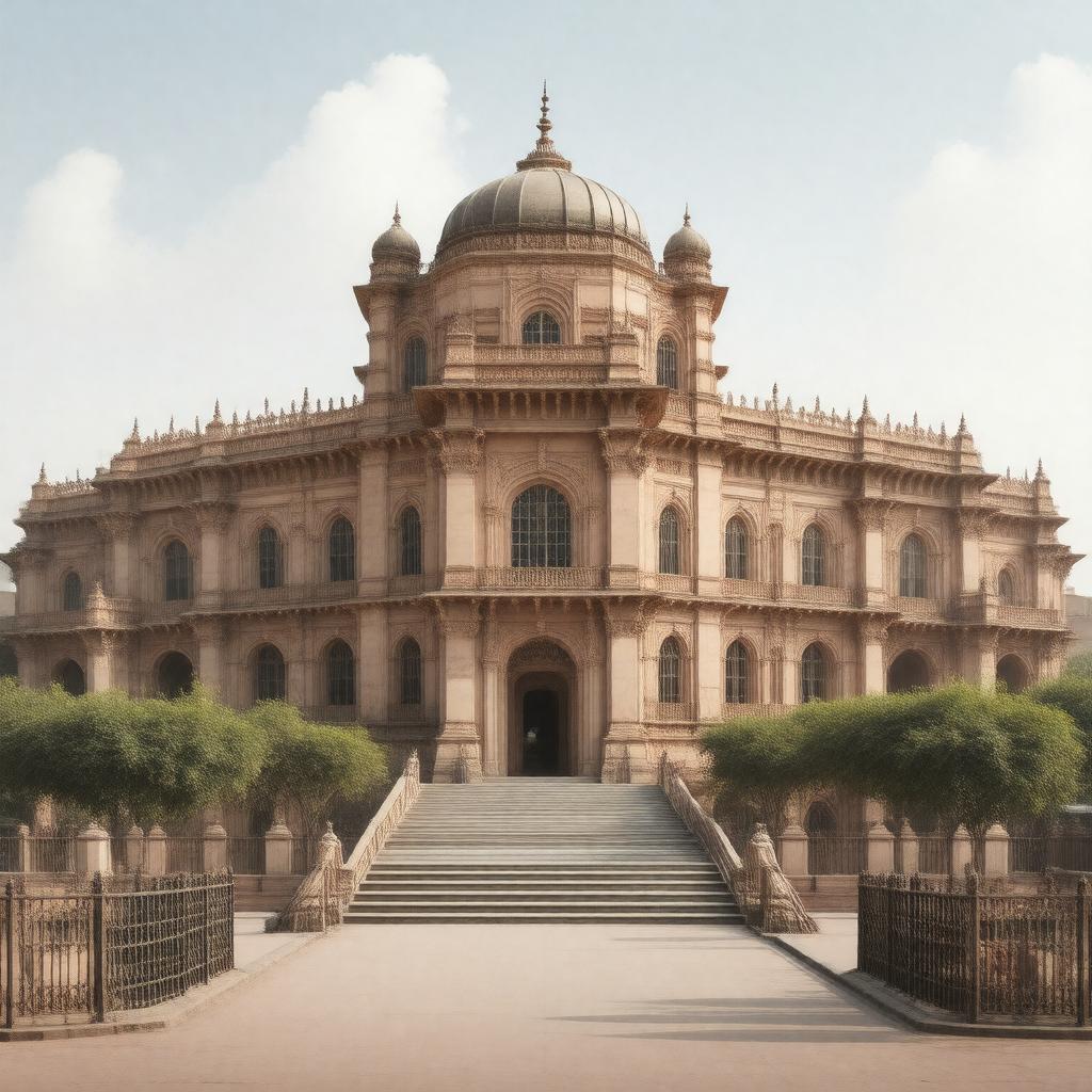 "Generate an image of the main administrative building or a representative landmark of Mahatma Gandhi Kashi Vidyapith, a public university located in Varanasi, Uttar Pradesh, India. The image should showcase the building's architecture, possibly with a blend of modern and traditional Indian elements, set against a backdrop that reflects the city's cultural and historical significance. Incorporate elements that symbolize education, such as students, books, or educational symbols, in a manner that complements the architectural style of the building. The scene should be vibrant yet serene, capturing the essence of a prestigious educational institution. Style: Realistic with a touch of traditional Indian architectural aesthetics."