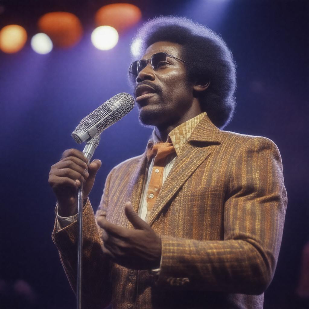 Generate an image of Major Harris, an American soul and R&B singer, in his prime, performing on stage with a microphone in hand, wearing 1970s-style attire, with a subtle background that hints at his association with The Delfonics and Atlantic Records, capturing his influential musical legacy.