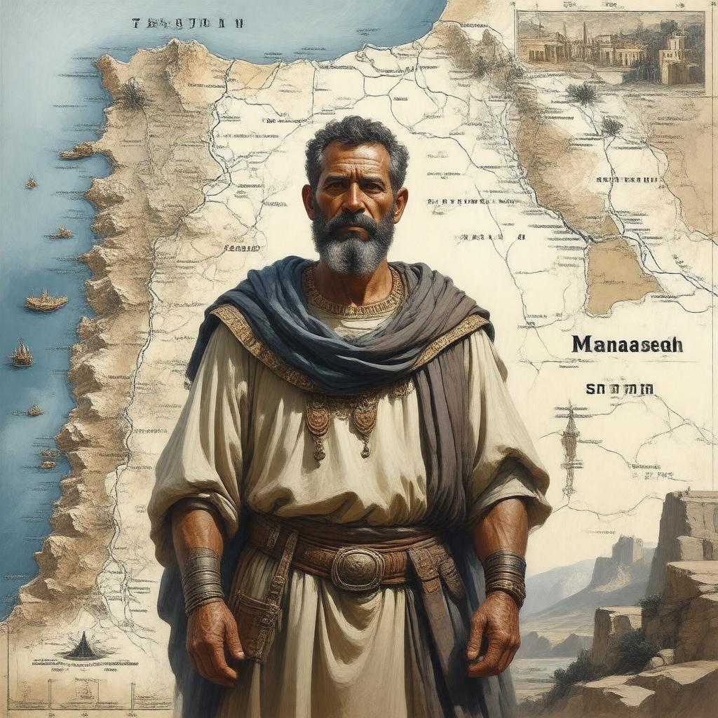 Generate an image of a biblical-era Israelite tribe leader standing in front of a map or illustration of the tribal territories of Israel, specifically highlighting the regions of Transjordan and Canaan, with a subtle background hint of the city of Samaria, symbolizing the Northern Kingdom of Israel; the leader, representing Manasseh, is dressed in traditional ancient Hebrew attire, with a solemn and authoritative expression, embodying his role as the patriarch of the Tribe of Manasseh; the style should be a realistic depiction with elements of historical and biblical accuracy.