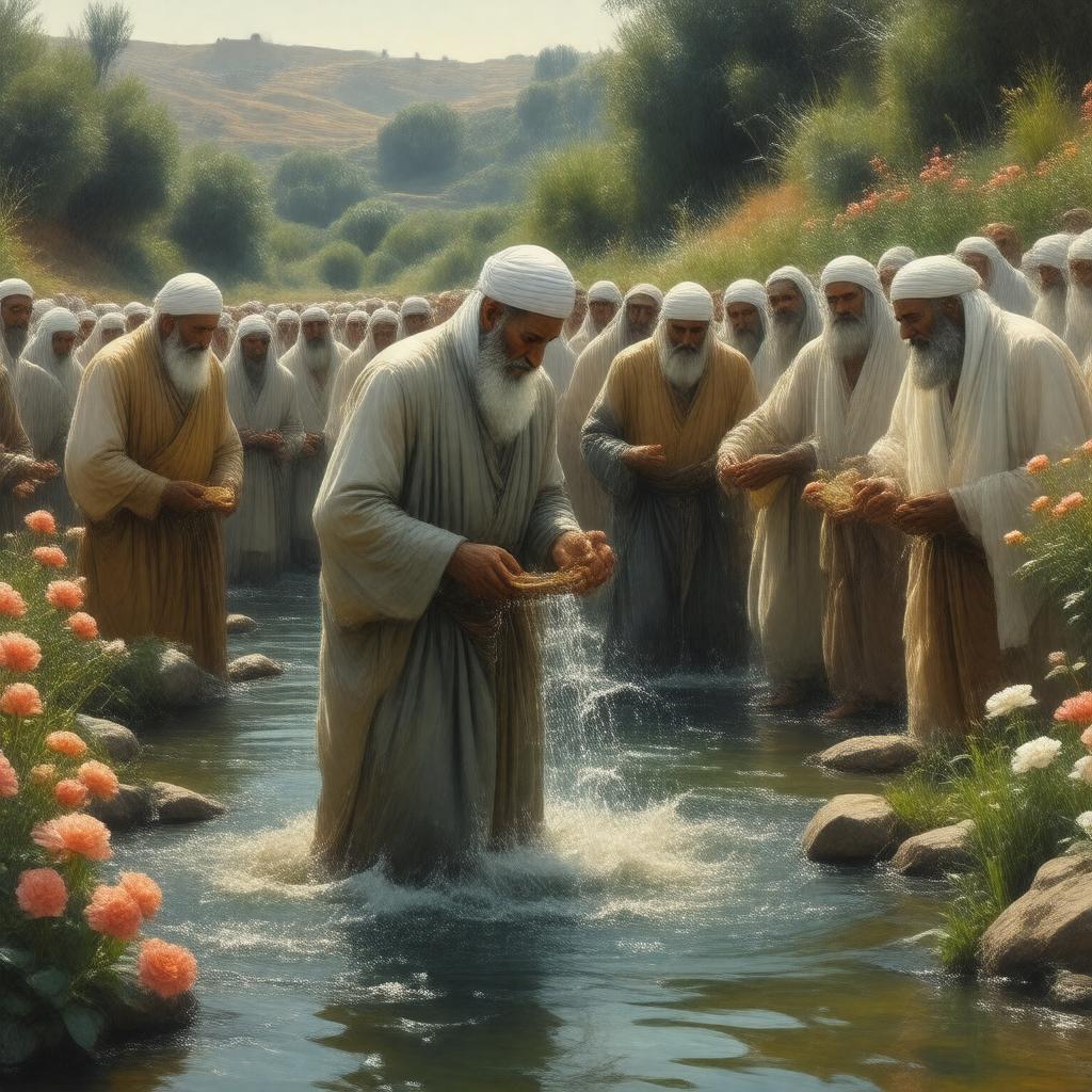 "Generate an image of a Mandaean community gathered near a river in Iraq, with a traditional Mandaean priest (Tarmida) performing a baptism ritual, surrounded by vibrant flowers and greenery, with a subtle representation of the Ginza Rabba scripture in the background, in a serene and mystical style that reflects the peaceful and spiritual nature of the Mandaeans, a religious organization."